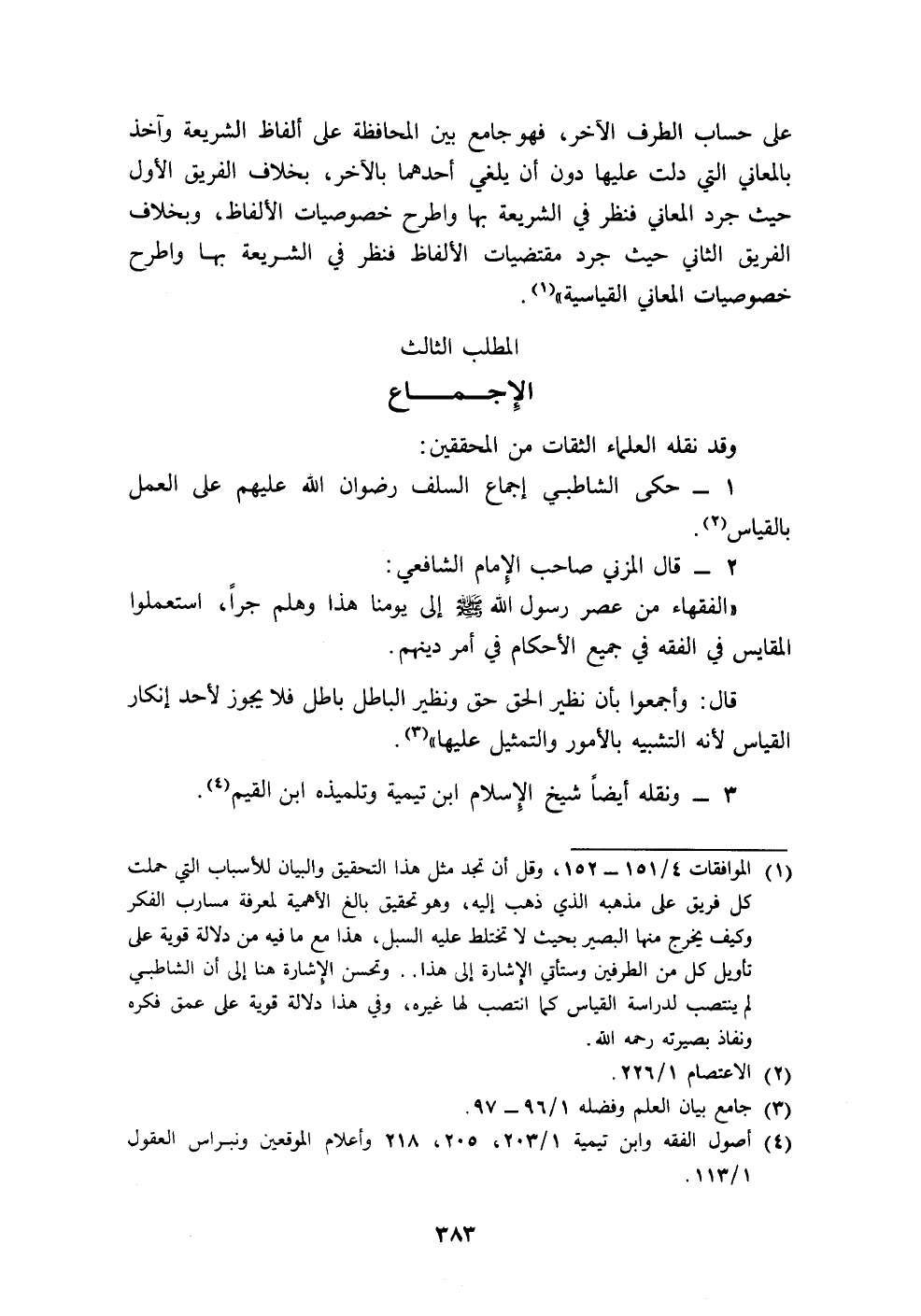(١) الموافقات ٤/ ١٥١ - ١٥٢، وقل أن تجد مثل هذا التحقيق والبيان للأسباب التي حملت كل فريق على مذهبه الذي ذهب إليه، وهو تحقيق بالغ الأهمية لمعرفة مسارب الفكر وكيف يخرج منها البصير بحيث لا تختلط عليه السبل، هذا مع ما فيه من دلالة قوية على تأويل كل من الطرفين وستأتي الإشارة إلى هذا .. وتحسن الإِشارة هنا إلى أن الشاطبي لم ينتصب لدراسة القياس كما انتصب لها غيره، وفي هذا دلالة قوية على عمق فكره ونفاذ بصيرته -رَحِمَهُ اللهُ-.
