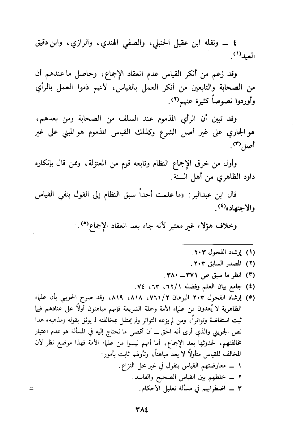(٥) إرشاد الفحول ٢٠٣ البرهان ٢/ ٧٦١، ٨١٨، ٨١٩، وقد صرح الجويني بأن علماء الظاهرية لا يُعدون من علماء الأمة وحملة الشريعة فإنهم مباهتون أولاً على عنادهم فيما ثبت استفاضة وتواتراً، ومن لم يزعه التواتر ولم يحتفل بمخالفته لم يوثق بقوله ومذهبه" هذا نص الجويني والذي أرى أنه الحق - أن أقصى ما نحتاج إليه في المسألة هو عدم اعتبار مخالفتهم، لحدوثها بعد الإِجماع، أما أنهم ليسوا من علماء الأمة فهذا موضع نظر لأن المخالف للقياس متأولاً لا يعد مباهتاً، وتأولهم ثابت بأمور: