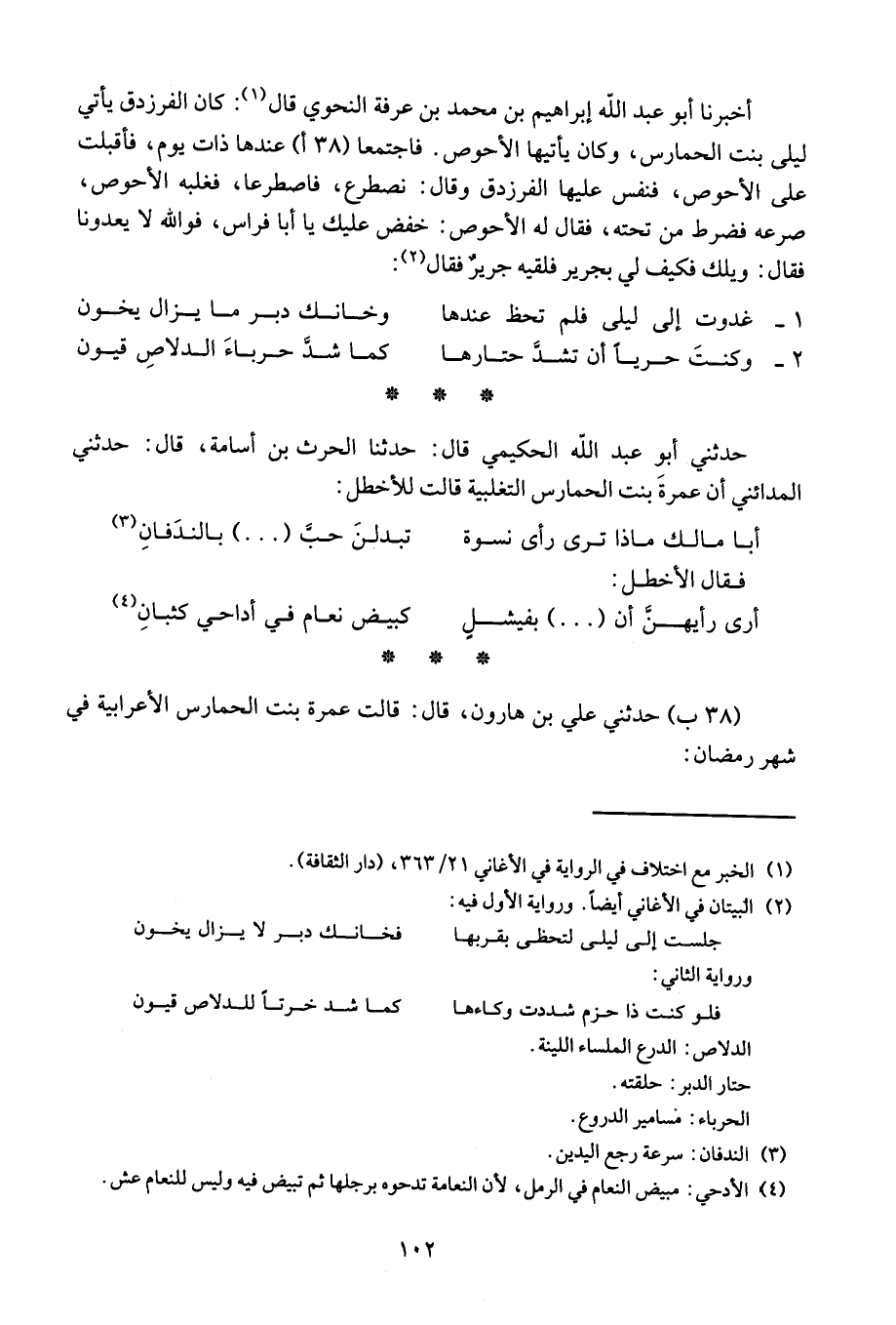 أخبرنا أبو عبد الله إبراهيم بن محمد بن عرفة النحوي قال: كان الفرزدق يأتي ليلى بنت الحمارس، وكان يأتيها الأحوص. فاجتمعا عندها ذات يوم، فأقبلت على الأحوص، فنفس عليها الفرزدق وقال: نصرع، فاصطرعا، فغلبه الأحوص، صرعه فضرط من تحته، فقال له الأحوص: خفض عليك يا أبا فراس، فو الله لا يعدونا فقال: ويلك فكيف لي بجرير فلقيه جرير فقال: