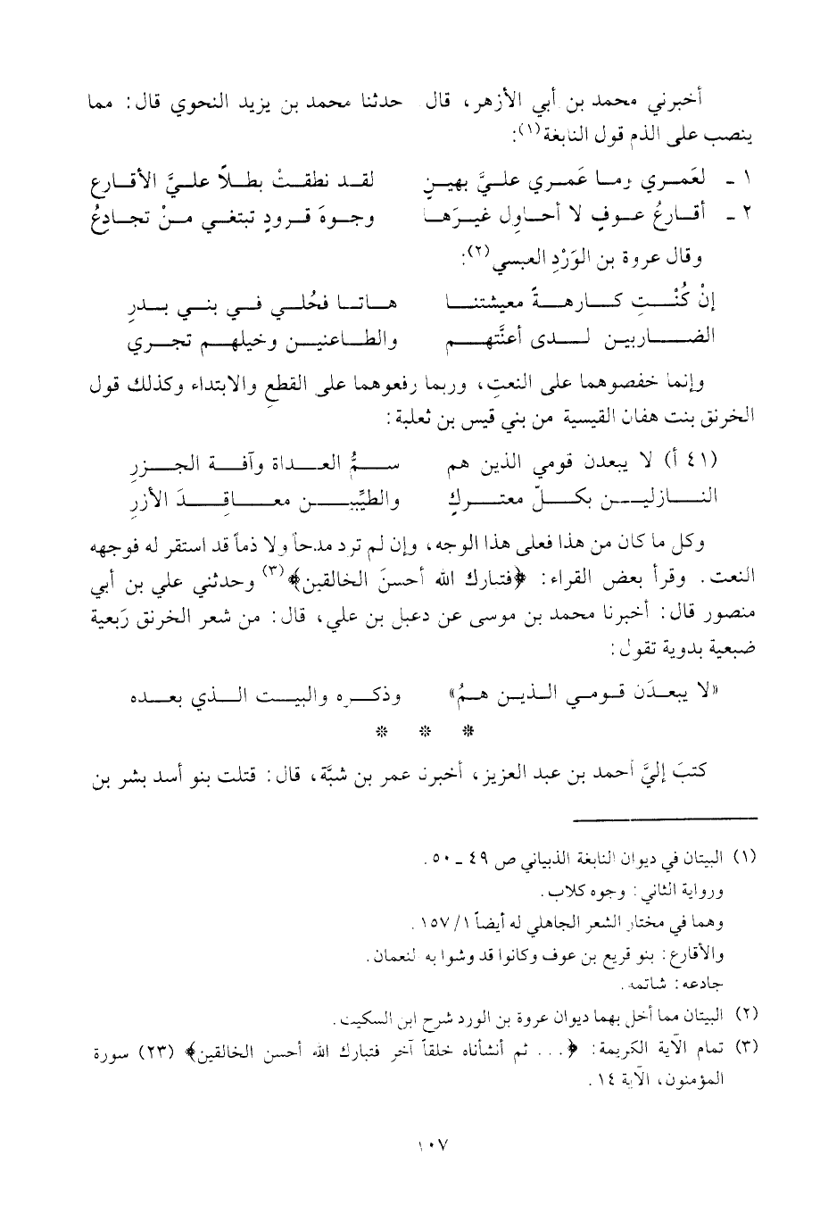 وكل ما كان من هذا فعلى هذا الوجه، وإن لم ترد مدحاً ولا ذماً قد استقر له فوجهه النعت. وقرأ بعض القراء: " فتبارك الله أحسن الخالقين " وحدثني علي ابن أبي منصور قال: أخبرنا محمد بن موسى عن دعبل بن علي، قال: من شعر الخرنق ربعية ضبعية بدوية تقول: