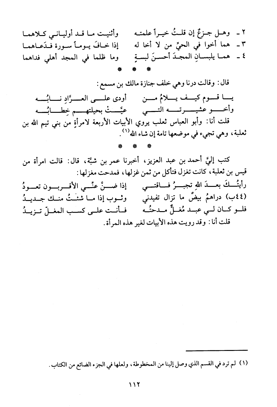 قلت أنا: وأبو العباس ثعلب يروي الأبيات الأربعة لامرأة من بني تيم الله بن ثعلبة، وهي تجيء في موضوعها تامة إن شاء الله.