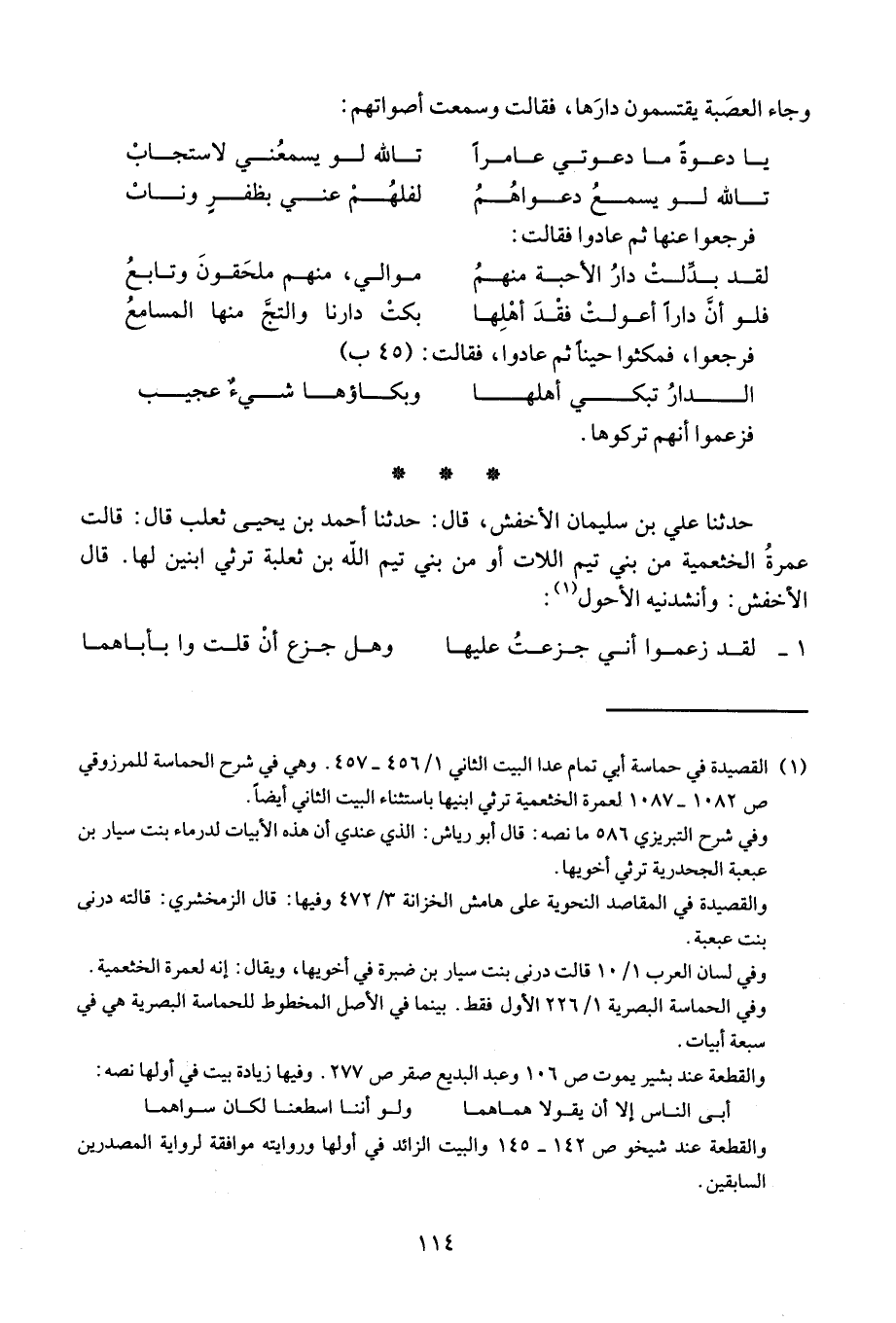حدثنا علي بن سليمان الأخفش، قال: حدثنا أحمد بن يحيى ثعلب قال: قالت عمرة الخثمعية من بني تيم اللات أو من بني تيم الله بن ثعلبة ترثي ابنين لها. قال الأخفش: وأنشدنيه الأحول: