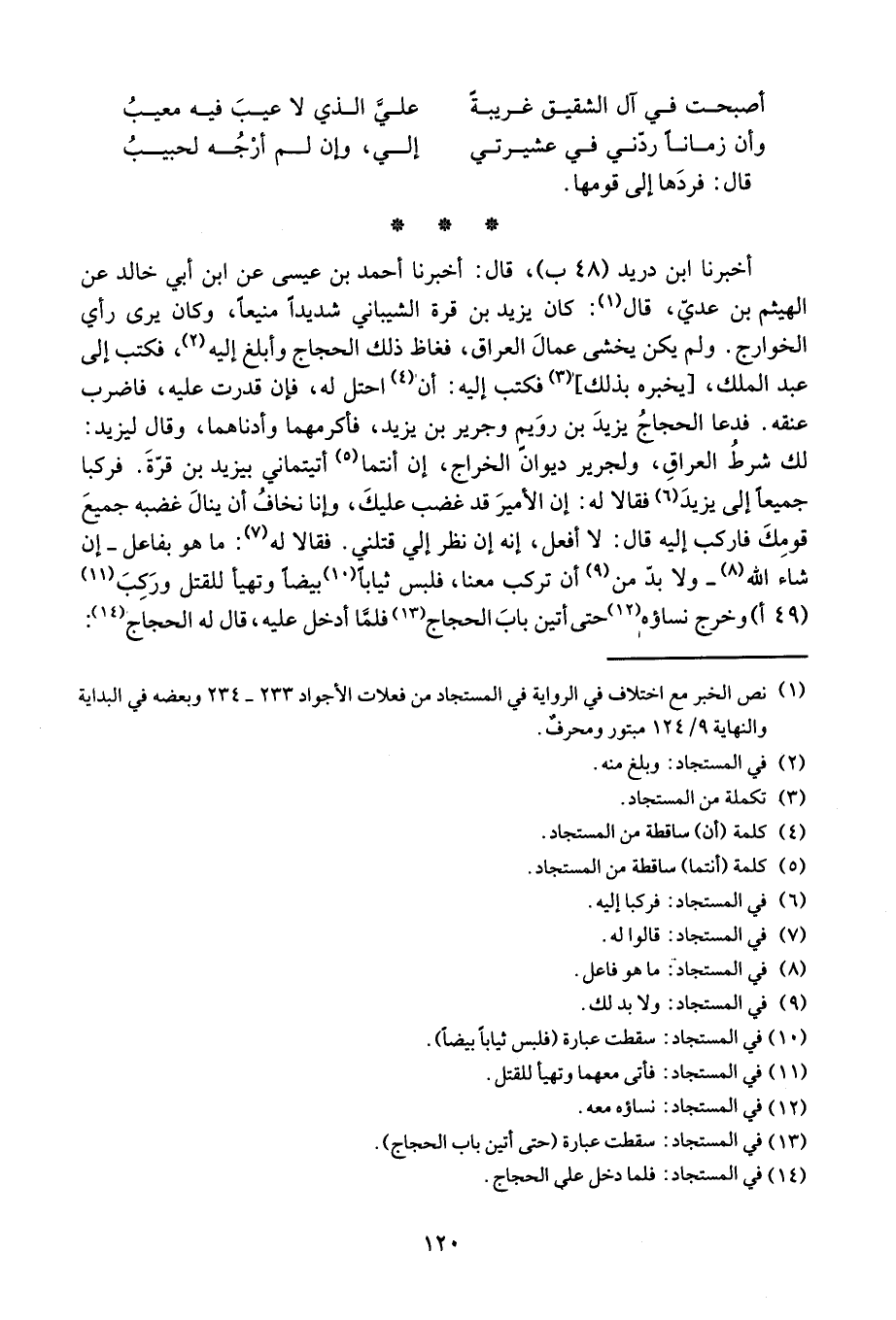 أخبرنا ابن دريد، قال: أخبرنا أحمد بن عيسى عن ابن أبي خالد عن الهيثم بن عدي، قال: كان يزيد بن قرة الشيباني شديداً منيعاً، وكان يرى رأي الخوارج. ولم يكن يخشى عمال العراق، فغاظ ذلك الحجاج وأبلغ إليه، فكتب عبد الملك " يخبره بذلك " فكتب إليه: أن أحتل له، فإن قدرت عليه، فاضرب عنقه. فدعا الحجاج يزيد بن رويم وجرير بن يزيد، فأكرمهما وأدناهما، وقال ليزيد: لك شرط العراق، ولجرير ديوان الخرج، إن أنتما أتيتماني بيزيد بن قرة. فركبا جميعاً إلى يزيد فقالا له: إن الأمير قد غضب عليك، وإنا نخاف أن ينال غضبه جميع قومك فاركب إليه قال: لا أفعل، إنه إن نظر إلي قتلني. فقالا له: ما هو بفاعل - إن شاء الله - ولابد من أن تركب معنا، فلبس ثياباً بيضاً وتهيأ للقتل وركب وخرج نساؤه حتى أتين باب الحجاج فلما أدخل عليه، قال له الحجاج: