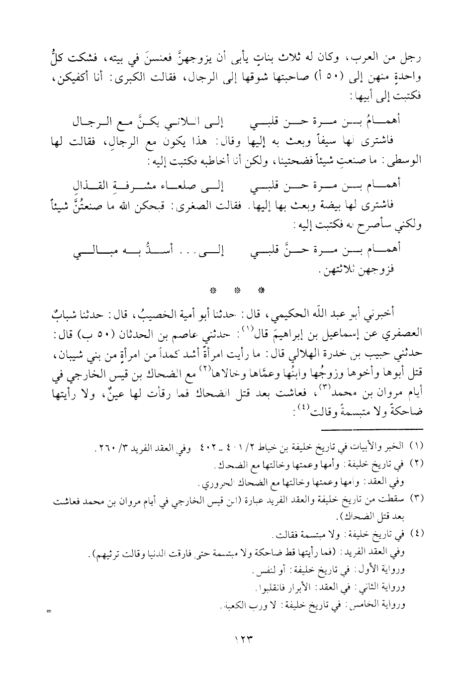 أخبرني أبو عبد الله الحكيمي، قال: حدثنا أبو أمية الخصيب، قال: حدثنا شباب العصفري عن إسماعيل بن إبراهيم قال: حدثني عاصم بن الحدثان قال: حدثني حبيب بن خدرة الهلالي قال: ما رأيت امرأة أشد كمدا ًمن امرأة بني شيبان، قتل أبوها أخوها وزوجها وابنها وعماها وخالاها مع الضحاك بن قيس الخارجي في أيام مروان بن محمد، فعاشت بعد قتل الضحاك بن قيس الخارجي في أيام مروان بن محمد، فعاشت بعد قتل الضحاك فما رقأت لها عين، ولا رأيتها ضاحكة ولا مبتسمة وقالت: