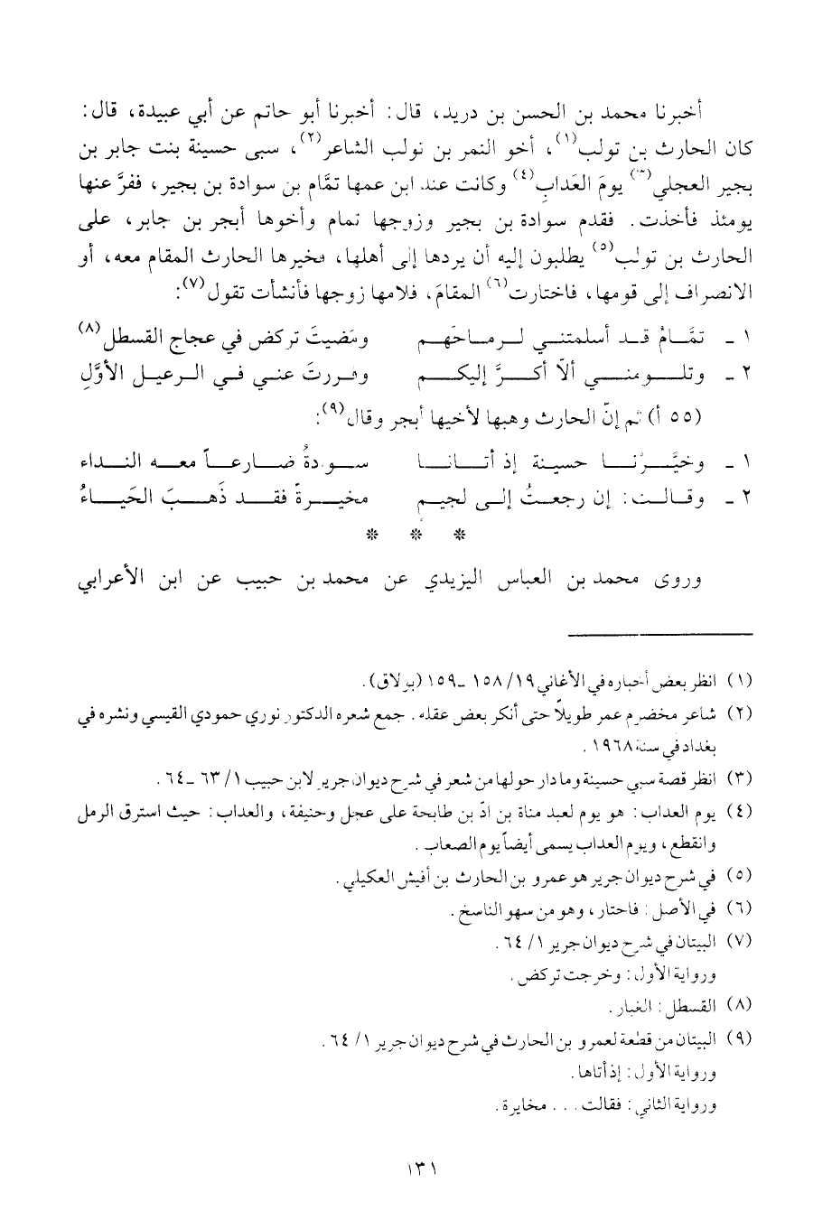 أخبرنا محمد بن الحسن بن دريد، قال: أخبرنا أبو حاتم عن أبي عبيدة، قال: كان الحارث بن تولب، أخو النمر بن تولب الشاعر، سبى حسينة بنت جابر بنت بجير العجلي يوم العداب وكانت عند ابن عمها تمام بن سواده بن بجير ففرعنها يومئذ فأخذت. فقدم سوادة بن بجير وزوجها تمام وأخوها أبجر بن جابر، على الحارث بن تولب يطلبون إليه أن يردها إلى أهلها، فخيرها الحارث المقام معه، أو الانصراف إلى قومها، فاختارت المقام، فلامها زوجها فأنشأت تقول: