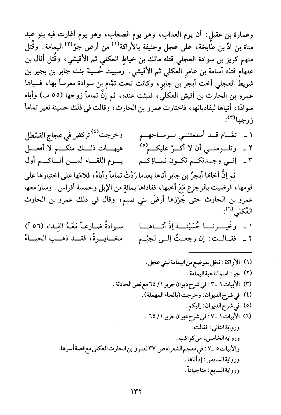 وعمارة بن عقيل: أن يوم العداب، وهو يوم الصعاب، وهو يوم أغارت فيه بنو عبد مناة بن اد بن طابخة، على عجل وحنيفة بالأراكة من أرض جو اليمامة. وقتل منهم كريز بن سواده العجلي قتله مالك بن خياط العكلي ثم الأقيشي. وسبيت حسينة بنت جابر بنت بجير بن شريط العجلي أخت أبجر بن جابر، وكانت تحت تمام سوادة معرساً بها، فسباها عمرو بن الحارث بن أقيش العكلي، فلبث عنده، ثم أن تماماً زوجها وأباه سوادة، أتياها ليفاديانها، فاختارت عمرو بن الحارث، وقالت في ذلك حسنية تعير تماماً زوجها: