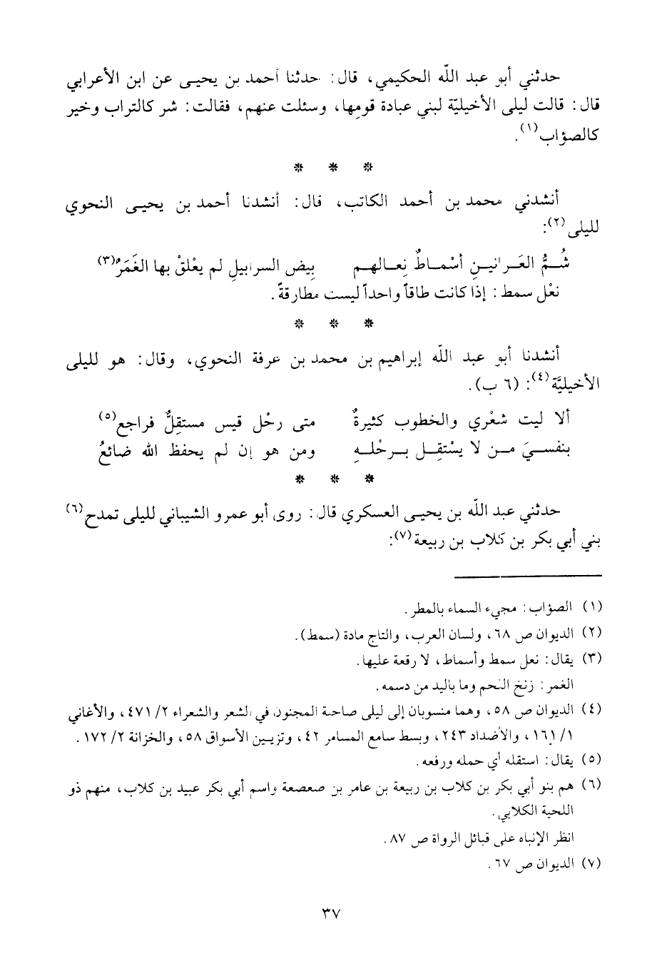 حدثني أبو عبد الله الحكيمي، قال: حدثنا أحمد بن يحيى عن ابن الأعرابي قال: قالت ليلى الأخيلية لبني عبادة قومها، وسئلت عنهم، فقالت: شر كالتراب وخير كالصؤاب.