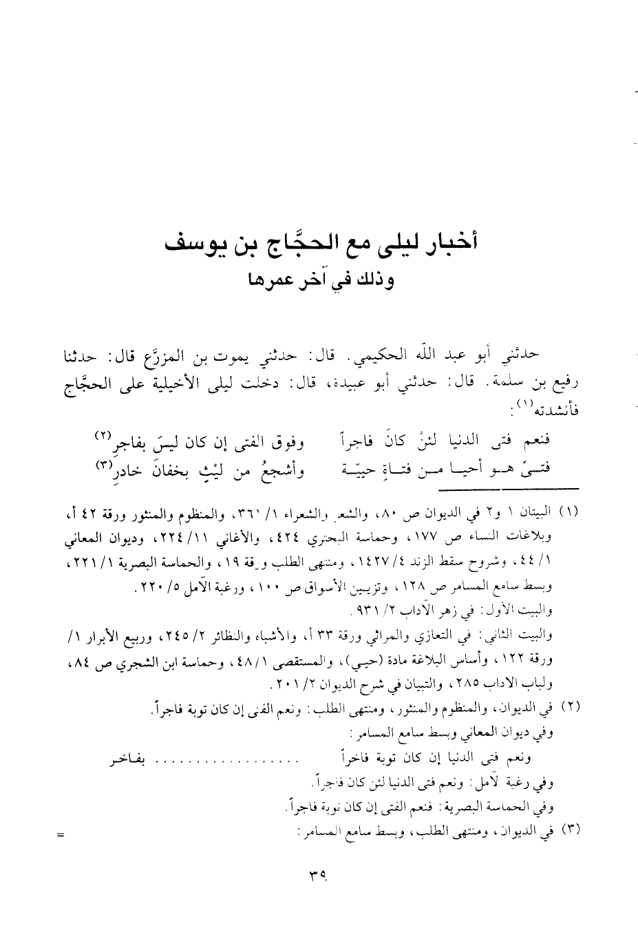 حدثني أبو عبد الله الحكيمي. قال: حدثني يحيى بن يموت بن المزرع قال: حدثنا رفيع بن سلمة. قال: حدثني أبو عبيدة، قال: دخلت ليلى الأخيلية على الحجاج فأنشدته: