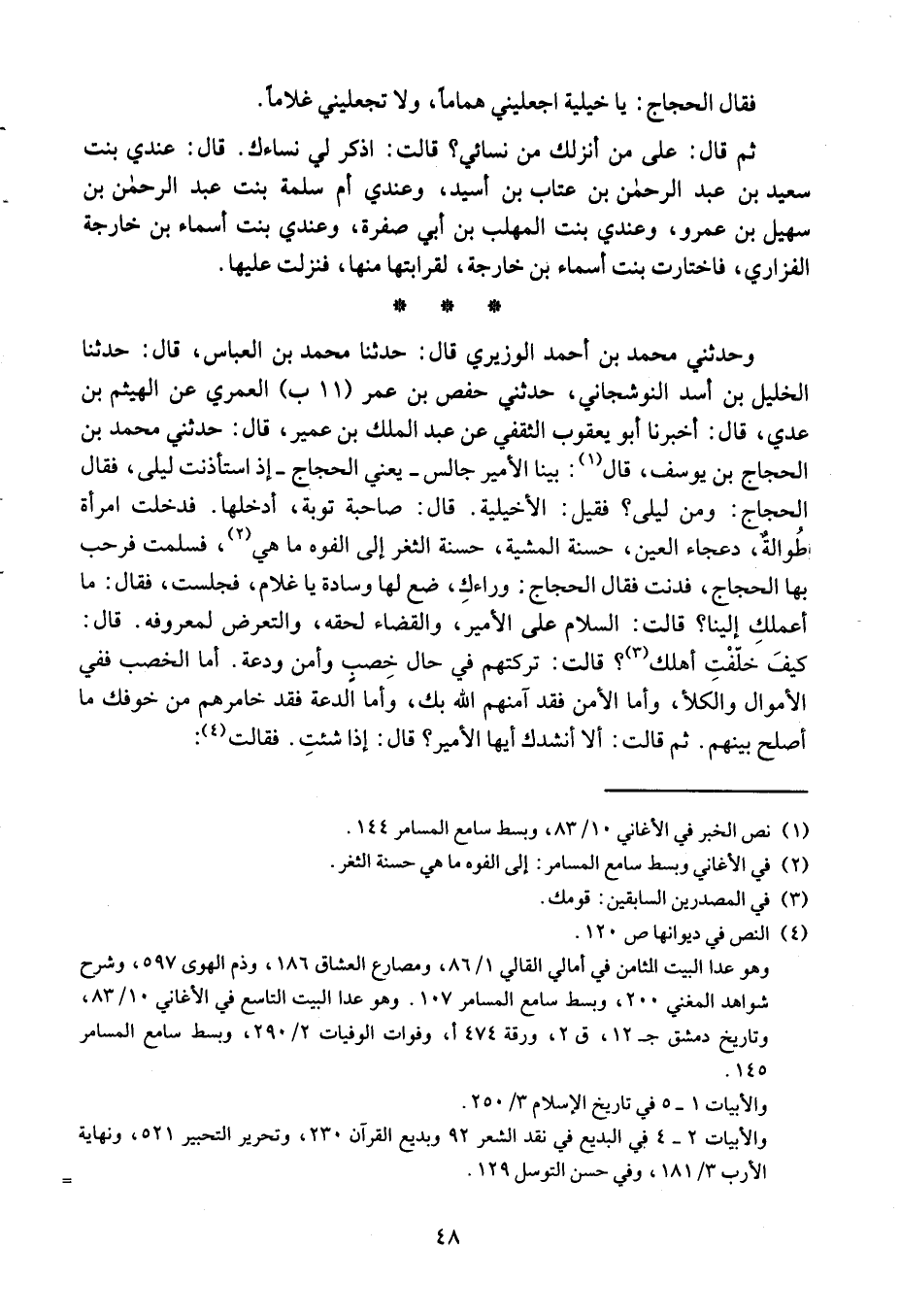 وحدثني محمد بن أحمد الوزيري قال: حدثنا محمد بن العباس، قال: حدثنا الخليل بن أسد النوشجاني، حدثني حفص بن عمر العمري عن الهيثم بن عدي، قال: أخبرنا أبو يعقوب الثقفي عن عبد الملك بن عمير، قال: حدثني محمد بن الحجاج بن يوسف، قال: بينا الأمير جالس - يعني الحجاج - إذ استأذنت ليلى، فقال الحجاج: ومن ليلى؟ فقيل: الأخيلية قال: صاحبة توبة، أدخلها. فدخلت امرأة طوالة، دعجاء العين، حسنة المشية، حسنة الثغر إلى الفوه ما هي، فسلمت فرحب بها الحجاج، فدنت فقال الحجاج: وراءك، ضع لها وسادة يا غلام، فجلست، فقال: ما أعملك إلينا؟ قالت السلام على الأمير، والقضاء لحقه، والتعرض لمعروفه. قال: كيف خلفت أهلك؟ قالت: تركتهم في حالة خصب وأمن ودعة. أما الخصب ففي الأموال والكلأ، وأما الأمن فقد آمنهم الله بك، وأما الدعة فقد خامرهم من خوفهم ما اصلح بينهم. ثم قالت: ألا أنشدك أيها الأمير؟ قال: إذا شئت. فقالت: