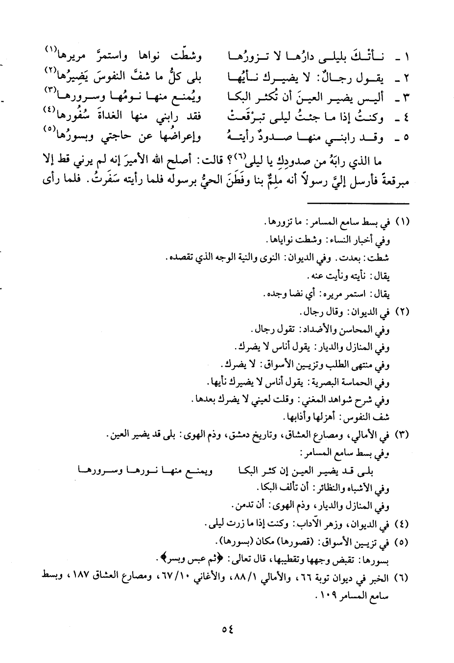ما الذي رابه من صدودك يا ليلى؟ قالت: أصلح الله الأمير أنه لم يرني قط إلا مبرقعة فأرسل لي رسولاً أنه ملم بنا وفطن الحي برسوله فلما رأيته سفرت. فلما رأى