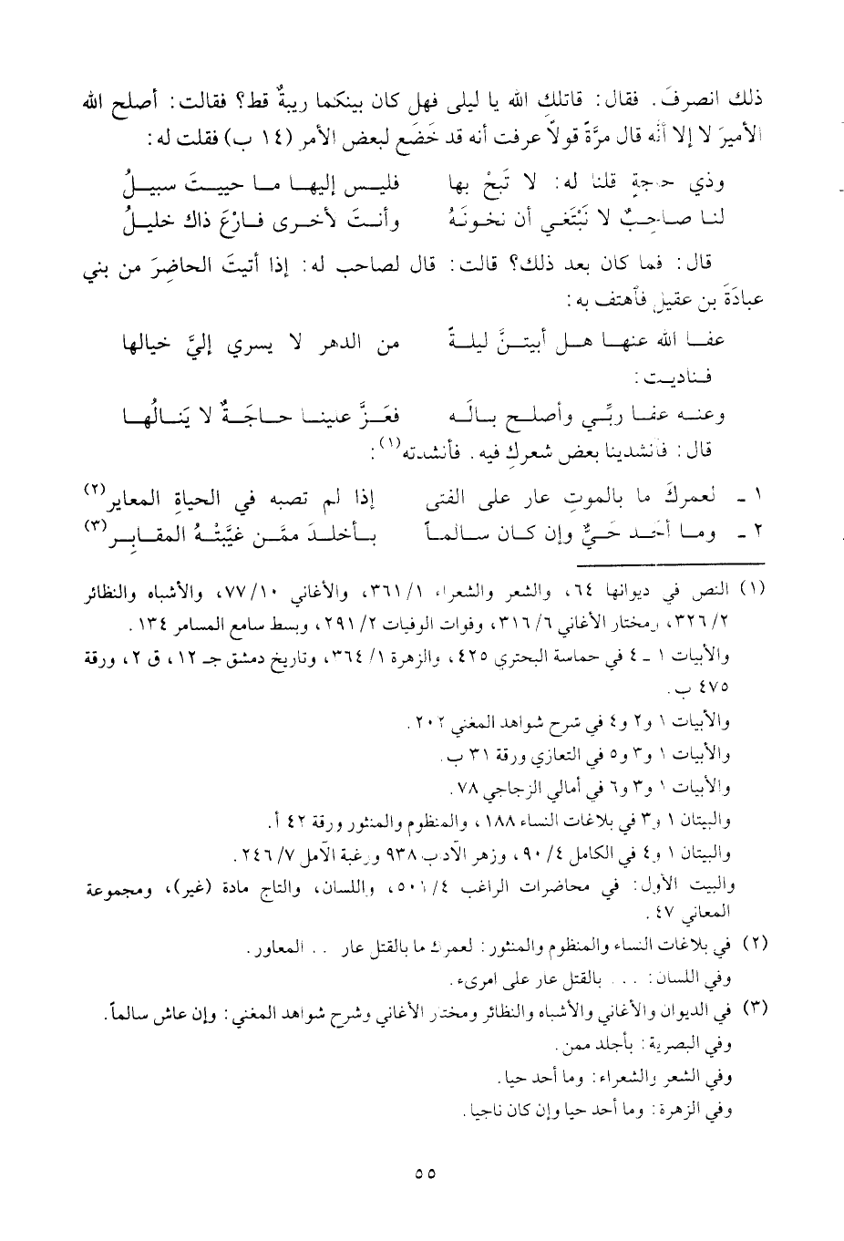 ذلك انصرف. فقال: قاتلك الله يا ليلى فهل كان بينكما ريبه قط؟ فقالت: أصلح الله الأمير لا إلا أنه قد قال مرة قولاً عرفت أنه قد خضع لبعض الأوامر فقلت له: