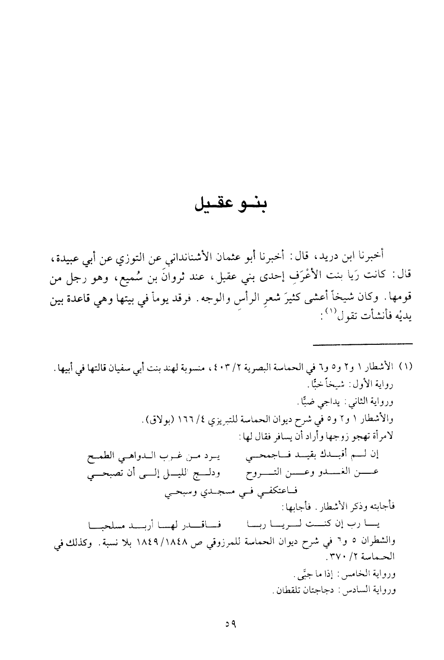 أخبرنا ابن دريد، قال: أخبرنا أبو عثمان الأشنانداني عن التوزي عن أبي عبيدة، قال: كانت ريا بنت الأعرف إحدى بني عقيل، عند ثروان بن السميع، وهو رجل من قومها. وكان شيخاً أعشى كثير شعر الرأس والوجه. فرقد يوماً في بيتها وهي قاعدة بين يديه فأنشأت تقول: