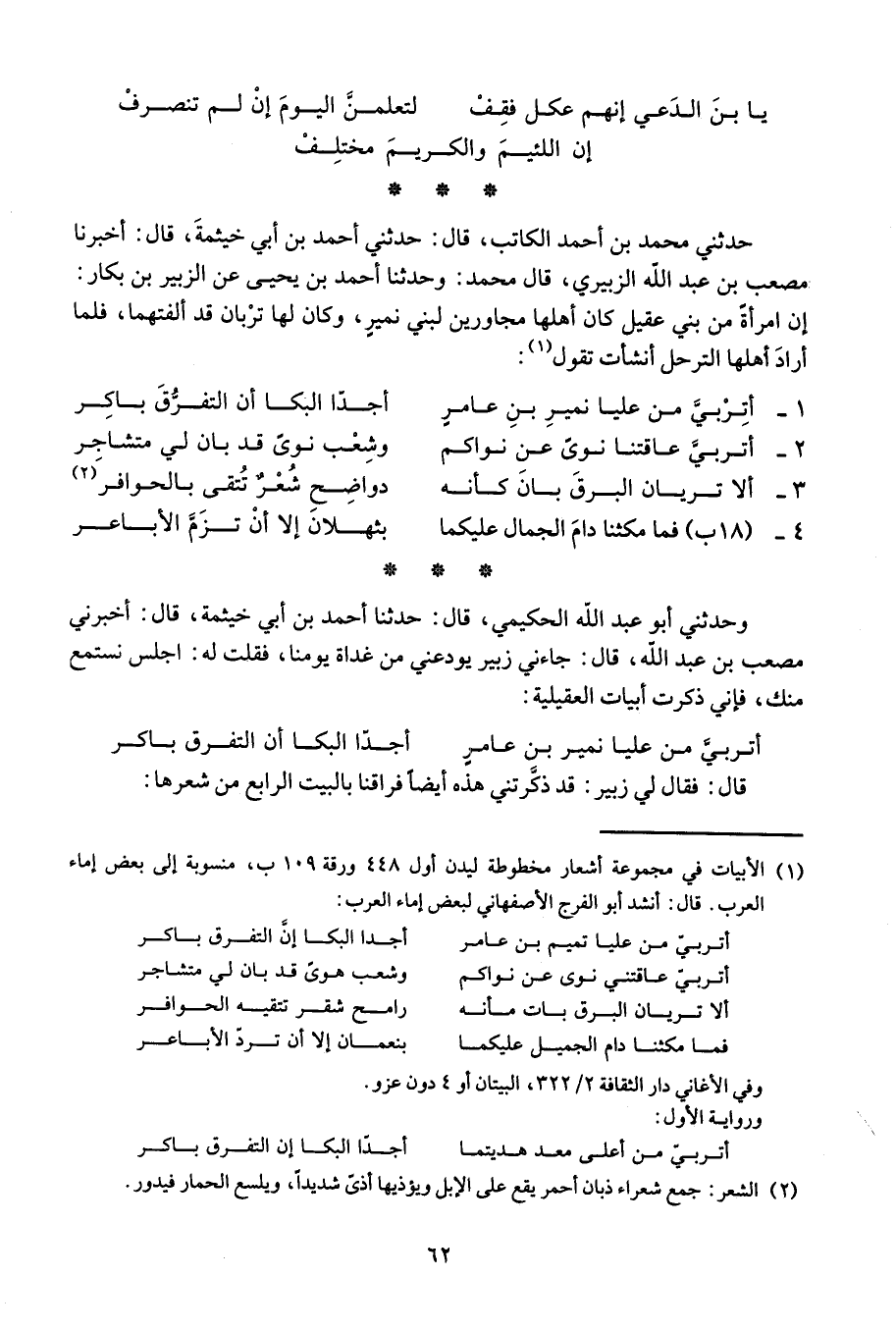 وحدثني أبو عبد الله الحكيمي، قال: حدثنا أحمد بن أبي خثيمة، قال: أخبرني مصعب بن عبد الله، قال: جاءني زبير يدعونني من غداة يومنا، فقلت له: اجلس نستمع منك، فأني ذكرت أبيات العقيلية: