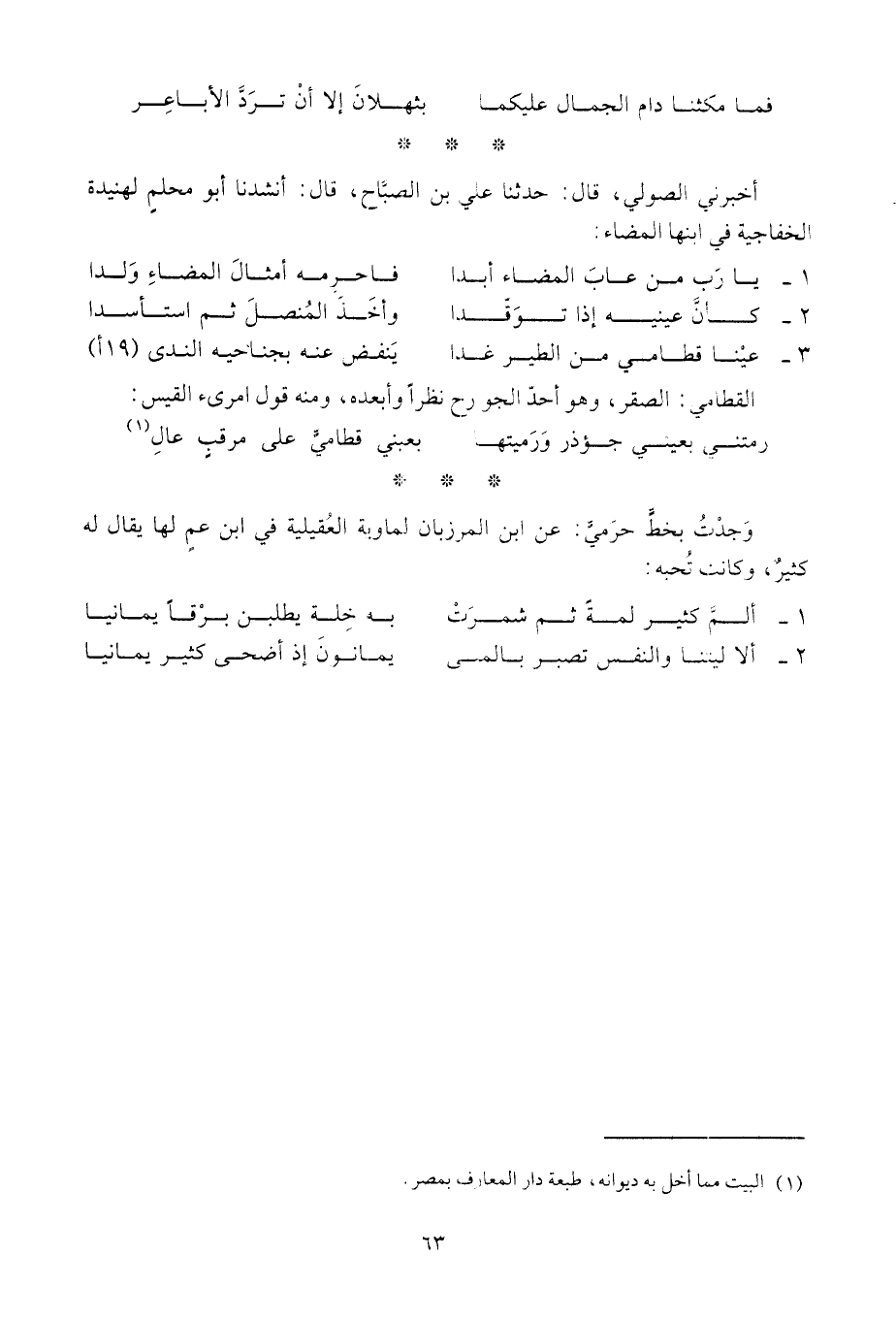 وجدت بخط حرمي: عن ابن المزربان لماوية العقيلية في ابن عم لها يقال له كثير وكانت تحبه: