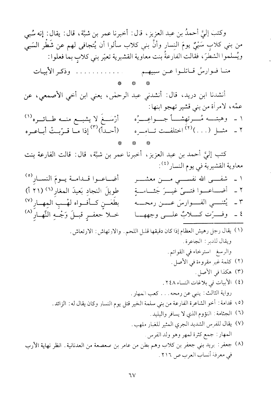 وكتب إلي أحمد بن عبد العزيز، قال: أخبرنا عمر بن شبة، قال: إنه سبي من بني بيت كلاب سبي يوم النسار وأن بني كلاب سألوا أن يتجافى لهم عن شطر السبي ويسلموا الشطر، فقالت الفارعة بنت معاوية القشيرية تعير بني كلاب بما فعلوا: منا فوارس قاتلوا سبيلهم.............. وذكر الأبيات.