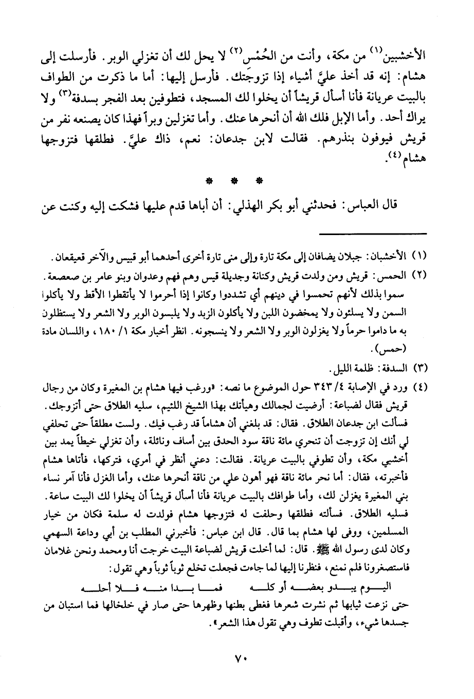 الأخشبين من مكة، وأنت من الحمس لا يحل لكي أن تعزلي الوبر. فأرسلت إلى هشام: إنه قد أخذ علي أشياء إذا تزوجك. فأرسل إليها: أما ما ذكرت من الطواف في البيت عريانة فأنا أسأل قريشاً أن يخلو لك المسجد، فتطوفين بعد الفجر بسدفة ولا يراك أحد. وأما الإبل فلك الله أن أنحرها عنك. وأما تغزلين وبراً فهذا كان يصنعه نفر من قريش فيوفون بنذرهم. فقالت لابن جدعان: نعم، ذلك علي. فطلقها فتزوجها هشام.
