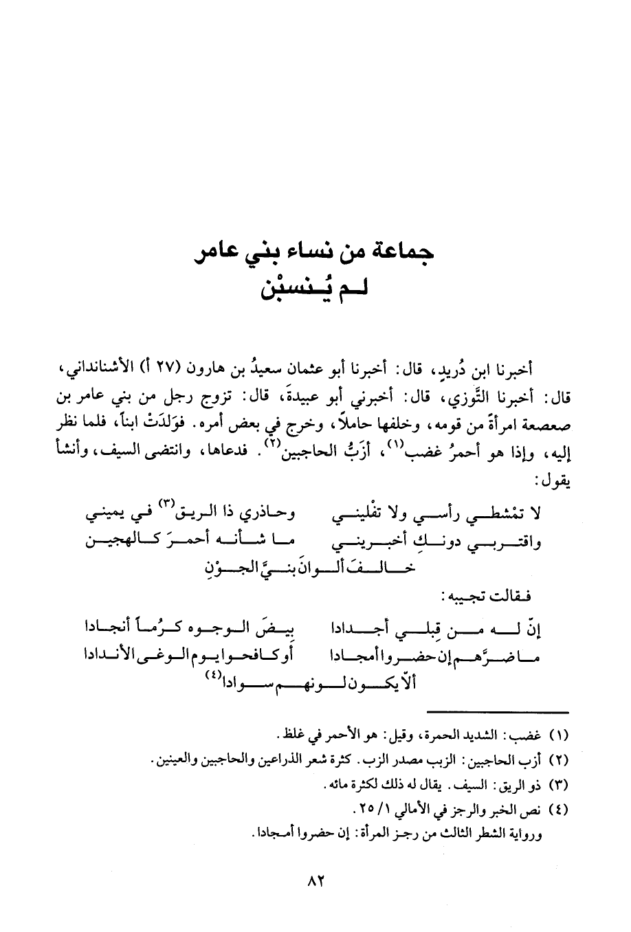 أخبرنا ابن دريد، قال: أخبرنا عثمان بن سعيد بن هارون الأشنانداني، قال: أخبرنا التوزي، قال: أخبرني أبو عبيدة، قال: تزوج رجل من بني عامر بن صعصعة امرأة من قومه، وخلفها حاملاً، وخرج في بعض أمره. فولدت ابناً، فلما نظر إلية، وإذا هو أحمر غضب، أزب الحاجبين. فدعاها، وانتضى السيف، وأنشأ يقول:
