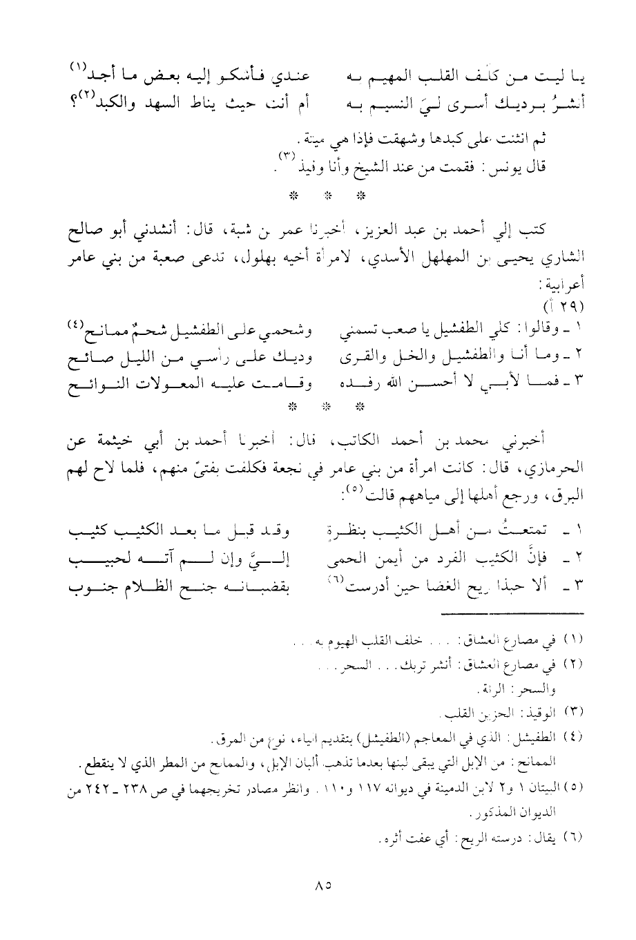 كتب إلي أحمد بن عبد العزيز، أخبرنا عمر بن شبة، قال: أنشدني أبو صالح الشاري يحيى بن المهلهل الأسدي، لامرأة أخيه بهلول، تدعى صعبة من بني عامر أعرابية: