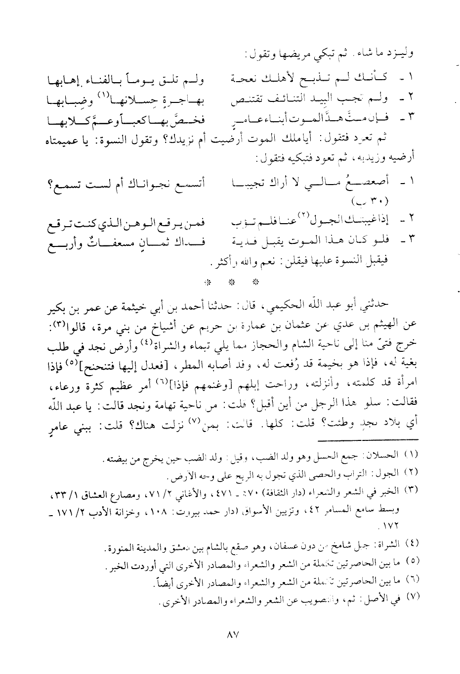 حدثني أبو عبد الله الحكيمي، قال: حدثنا أحمد بن أبي خثيمة عن عمر بن بكير عن الهيثم بن عدي عن عثمان بن عمارة بن حريم عن أشياخ من بني مرة، وقالوا: خرج فتى منا إلى ناحية الشام والحجاز مما يلي تيماء والشراة وأرض نجد في طلب بغية له، فإذا هو بخيمة قد رفعت له، وقد أصابه المطر، " فعدل إليها فتنحنح " فإذا امرأة قد كلمته، وأنزلته، وراحت إبلهم " وغنمهم فإذا " أمر عظيم كثرة ورعاء، فقالت سلوا هذا الرجل من أين أقبل؟ قلت: من ناحية تهامة ونجد قالت: يا عبد الله أي بلاد نجد وطئت؟ قلت كلها. قالت: بمن نزلت هناك؟ قلت: ببني عامر،