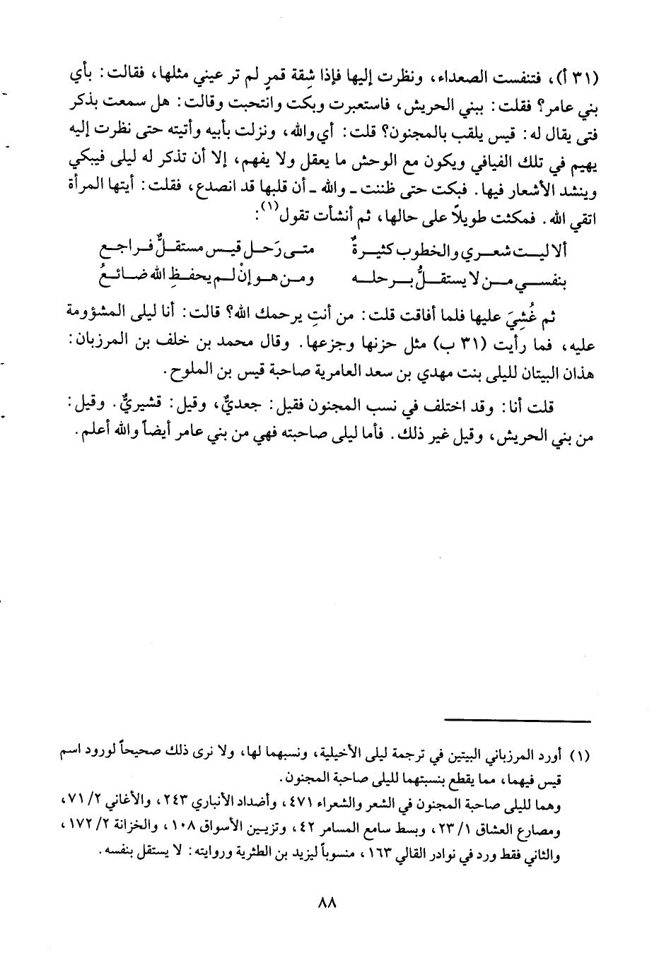فتنفست الصعداء، ونظرت إليها فإذا شقة قمر لم ترعيني مثلها، فقالت: بأي بني عامر؟ فقلت: ببني الحريش، فاستعبرت وبكت وانتحبت وقالت: هل سمعت بذكر فتى يقال له: قيس يلقب بالمجنون؟ قلت: أي والله، ونزلت بأبيه وأتيته حتى نظرت إليه يهيم في تلك الفيافي ويكون مع الوحش ما يعقل ولا يفهم، إلا أن تذكر له ليلى فيبكي وينشد الأشعار فيها. فبكت حتى ظنت - والله - أن قلبها قد انصدع، فقلت: أيتها المرأة اتقي الله. فمكثت طويلاً على حالها، ثم أنشأت تقول: