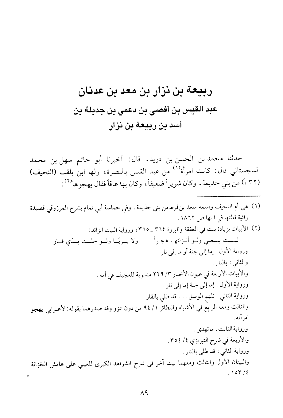 حدثنا محمد بن الحسين بن دريد، قال: أخبرنا أبو حاتم سهل بن محمد السجستاني قال: كانت امرأة من عبد القيس بالبصرة، ولها ابن يلقب " النحيف " من بني جذيمة، وكان شريراً ضعيفاً، وكان بها عاقاً فقال يهجوها: