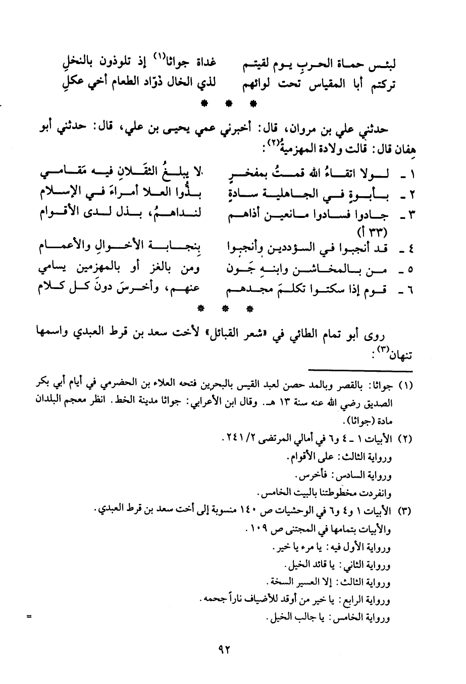 روى أبي تمام الطائي في " شعر القبائل " لأخت سعد بن قرط العبدي واسمها تنهان: