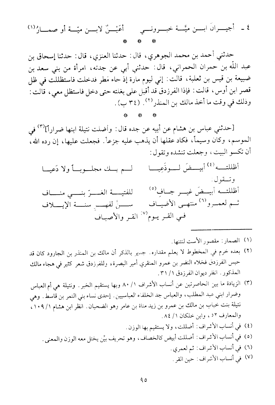 حدثني أحمد بن محمد الجوهري، قال: حدثنا العنزي، قال: حدثنا إسحاق بن عبد الله بن حمران الحمراني، قال: حدثني أبي عن جدته، امرأة من بني سعد بن ضبيعة بن قيس بن ثعلبة، قالت: فإذا الفرزدق قد أقبل على بغلته حتى دخل فاستظل معي، قالت: وذلك في وقت ما أخذ مالك بن المنذر.