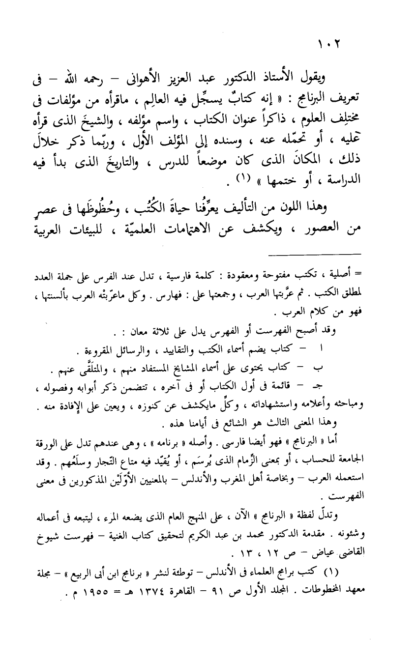 ويقول الأستاذ الدكتور عبد العزيز الأهواني - رحمه الله - في تعريف البرنامج: "إنه كتاب يسجل فيه العالم، ما قرأه من مؤلفات في مختلف العلوم، ذكراً عنوان الكتاب، واسم مؤلفه، وربما ذكر خلال ذلك، المكان الذي كان موضعاً لدرس، والتاريخ الذي بدأ فيه الدراسة، أو ختمها " (¬1) .