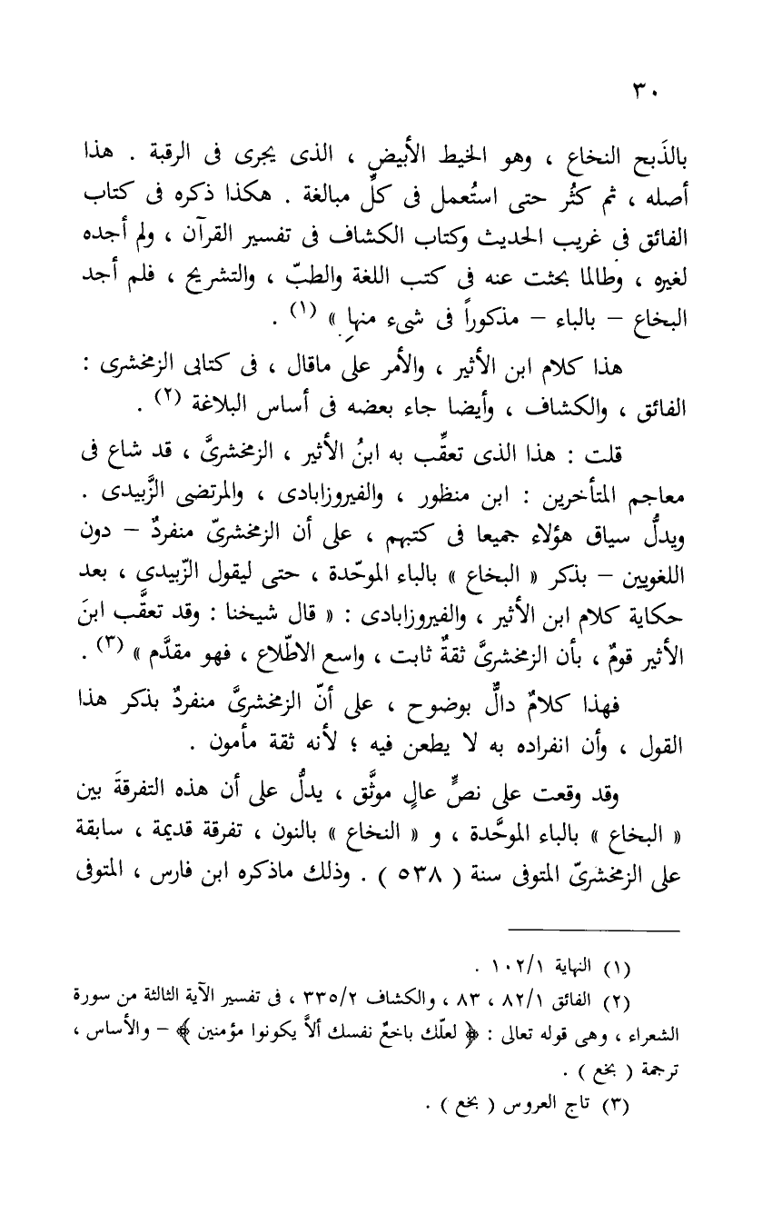 قلت: هذا الذي تعقب به ابن الأثير، الزمخشري، وقد شاع في معاجم المتأخرين: ابن منظور، والفيروزابادي، والمرتضى الزبيدي. ويدل سياق هؤلاء جميعاً في كتبهم، على أن الزمشخري منفرد - دون اللغويين - بذكر "البخاع" بالباء الموحدة، حتى ليقول الزبيدي، بعد حكاية كلام ابن الأثير، والفيروزابادي: "قال شيخنا: وقد تعقب ابن الأثير قوم، بأن الزمخشري ثقة ثابت، واسع الاطلاع، فهو مقدم" (¬3) .