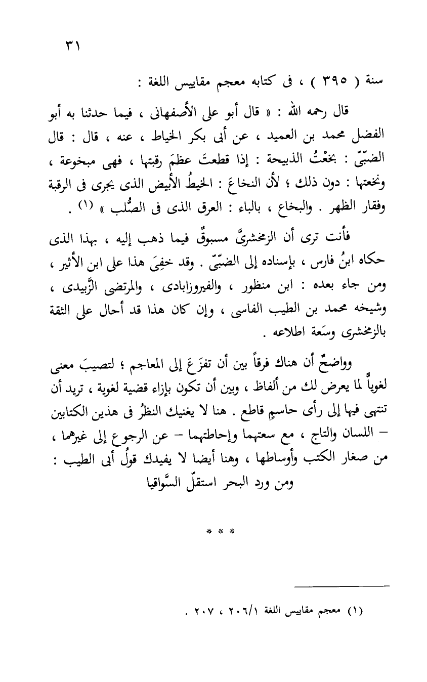 وواضح أن هناك فرقاً بين أن تفزع إلى المعاجم؛ لتصيب معنى لغوياً لما يعرض لك من ألفاظ، وبين أن تكون بإزاء قضية لغوية، تريد أن تنتهي فيها إلى رأي حاسم قاطع. هنا لا يغنيك النظر في هذين الكتابين - اللسان والتاج، مع سعتهما وإحاطتهما - عن الرجوع إلى غيرهما، من صغر الكتب وأوسطها، وهنا أيضاً لا يفيدك قول أبي الطيب: ومن ورد البحر استقل السواقيا.