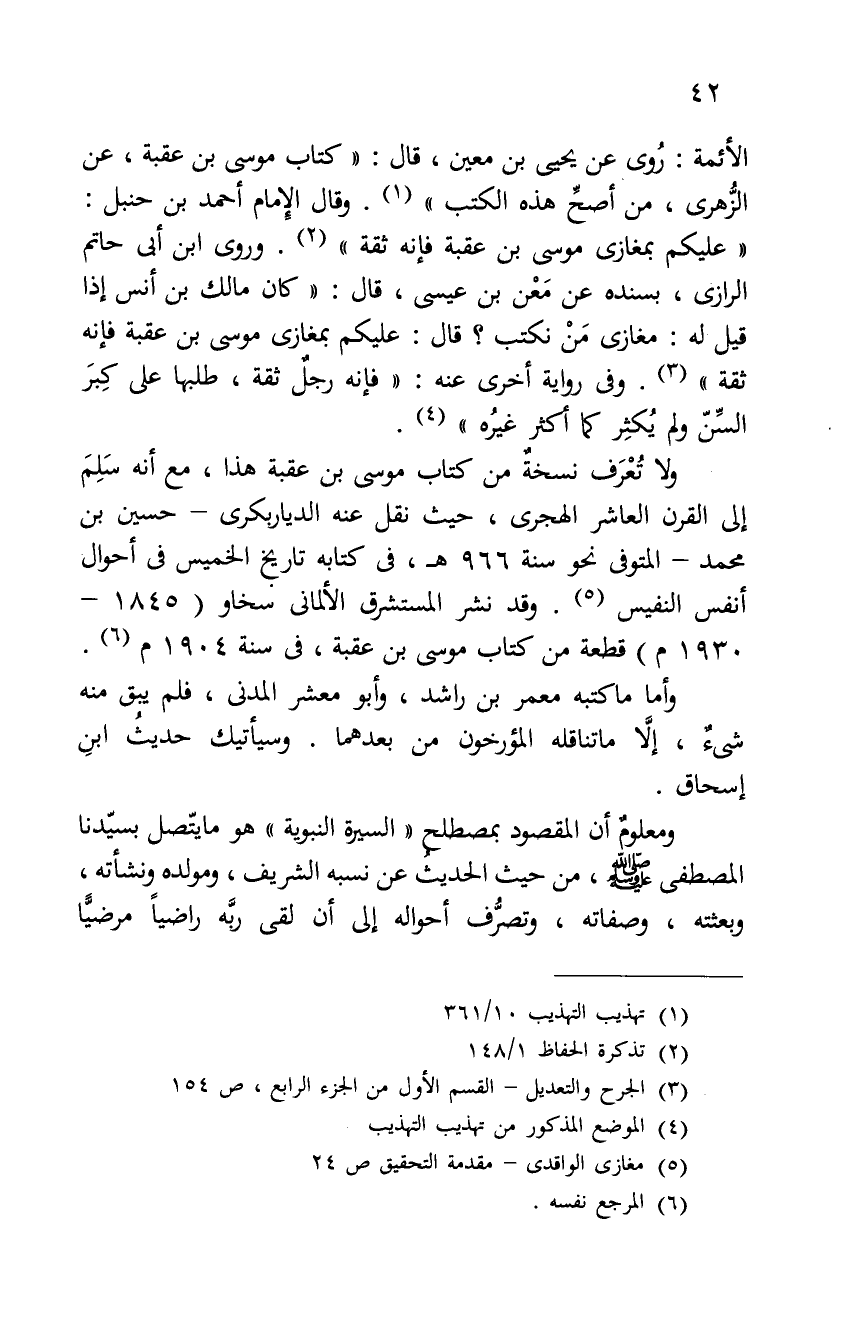 ولا تعرف نسخة من كتاب موسى بن عقبة هذا، مع أنه سلم إلى القرن العاشر الهجري، حيث نقل عنه الديار بكري - حسين بن محمد - المتوفى نحو سنة 966هـ، في كتابه تاريخ الخميس في أحوال أنفس النفيس (¬5) . وقد نشر المستشرق الألماني سخاو (1845 - 1930م) قطعة من كتاب موسى بن عقبة، في سنة 1904م (¬6) .