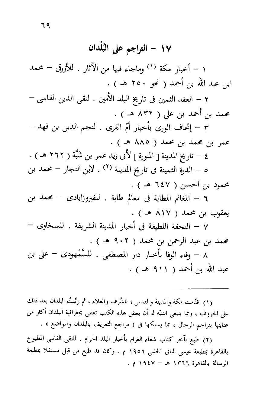 (¬2) طبع بآخر كتاب شفاء الغرام بأخبار البلد الحرام. للتقي الفاسي المطبوع بالقاهرة بمطبعة عيسى البابي الحلبي 1956م. وكان قد طبع من قبل مستقلا بمطبعة الرسالة بالقاهرة 1366هـ - 1947م.