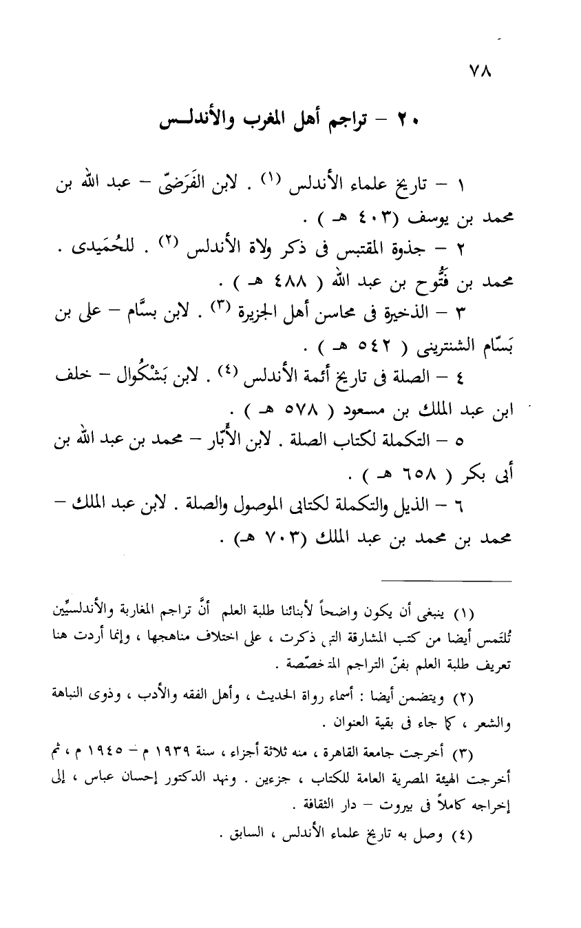 (¬1) ينبغي أن يكون واضحاً لأبنائنا طلبة العلم أن تراجم المغاربة والأندلسيين تلتمس أيضاً من كتب المشارقة التي ذكرت، على اختلاف مناهجها، وإنما أردت هنا تعريف طلبة العلم بفن التراجم المتخصصة.