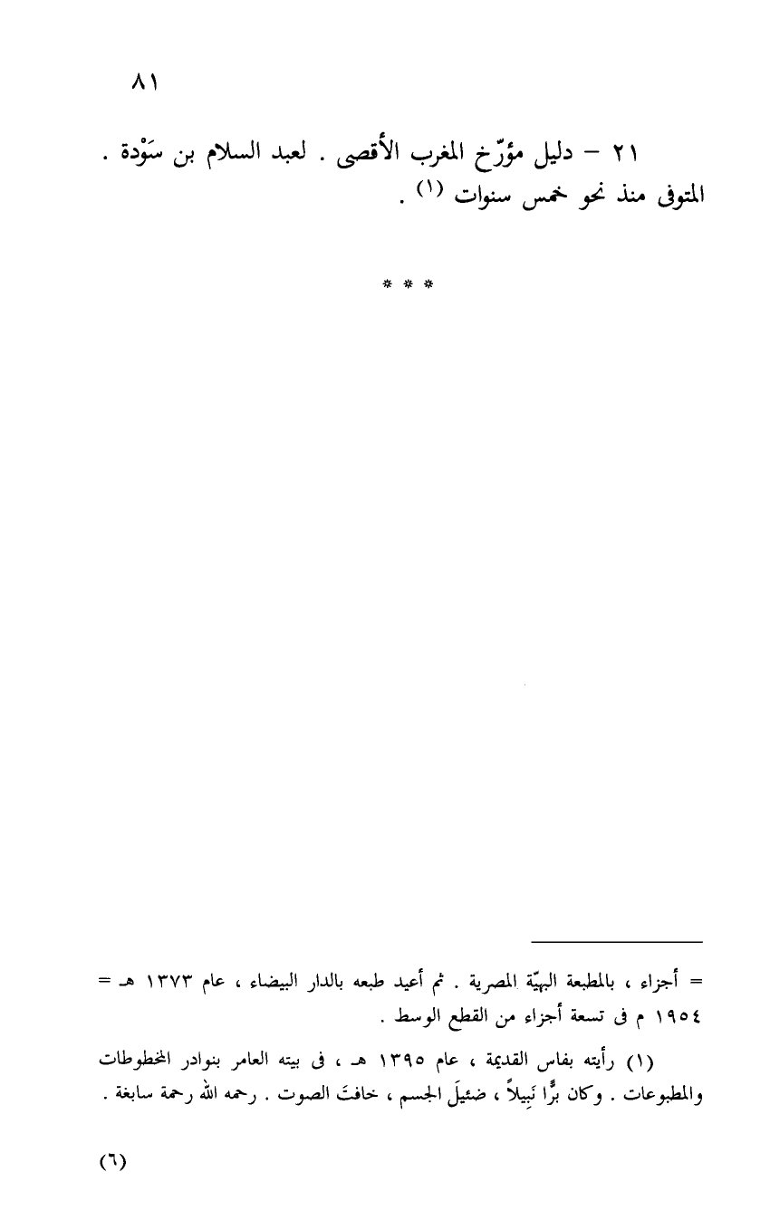21- دليل مؤرخ المغرب الأقصى. لعبد السلام بن سودة المتوفى منذ نحو خمس سنوات (¬1) .