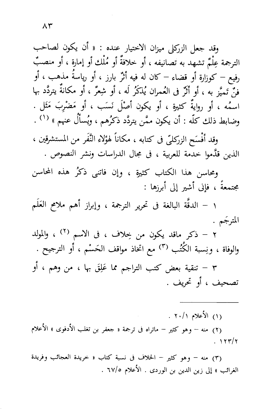 وقد جعل الزركلي ميزان الاختيار عنده: "أن يكون لصاحب الترجمة علم تشهد به تصانيفه، أو خلافة أو ملك أو إمارة، أو منصب رفيع - كوزارة أو قضاء - كان له فيه أثر بارز، أو رياسة مذهب، أو فن تميز به، أو أثر في العمران يذكر له، أو شعر، أو مكانة يتردد بها أسمه، أو رواية كثيرة، أو يكون أصل نسب، أو مضرب مثل. وضابط ذلك كله: أن يكون ممن يتردد ذكرهم، ويسأل عنهم " (¬1) .