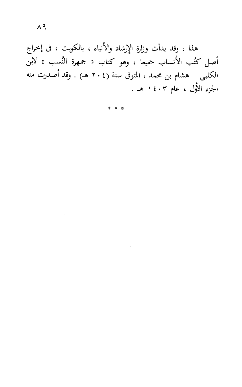 هذا وقد بدأت وزارة الإرشاد والأنباء، بالكويت، في إخراج أصل كتب الإنساب جميعا، وهو كتاب " جمهرة النسب " لابن الكلبى - هشام بن محمد، المتوفى سنة (204هـ) . وقد أصدرت منه الجزء الأول، عام 1403هـ.