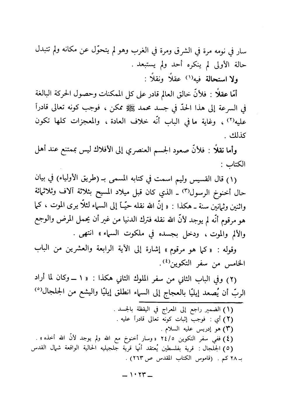 وأما نقلاً فلأن صعود الجسم العنصري إلى الأفلاك ليس بممتنع عند أهل الكتاب.