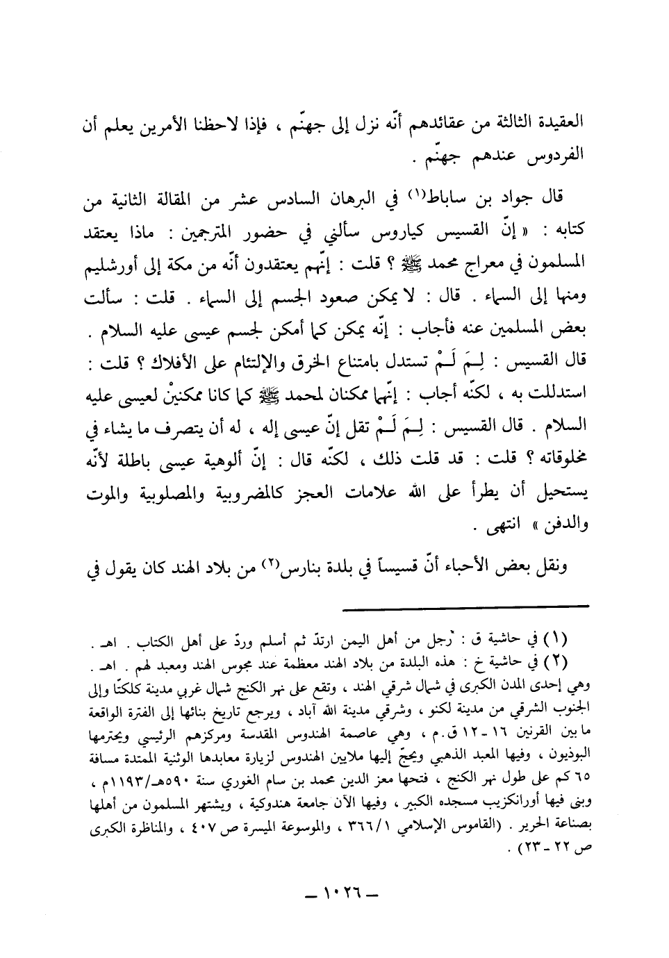 قال جواد بن ساباط في البرهان السادس عشر من المقالة الثانية من كتابه أن القسيس كياروس سألني في حضور المترجمين: ماذا يعتقد المسلمون في معراج محمد صلى الله عليه وسلم؟ قلت: إنهم يعتقدون أنه من مكة إلى أورشليم ومنه إلى السماء.
