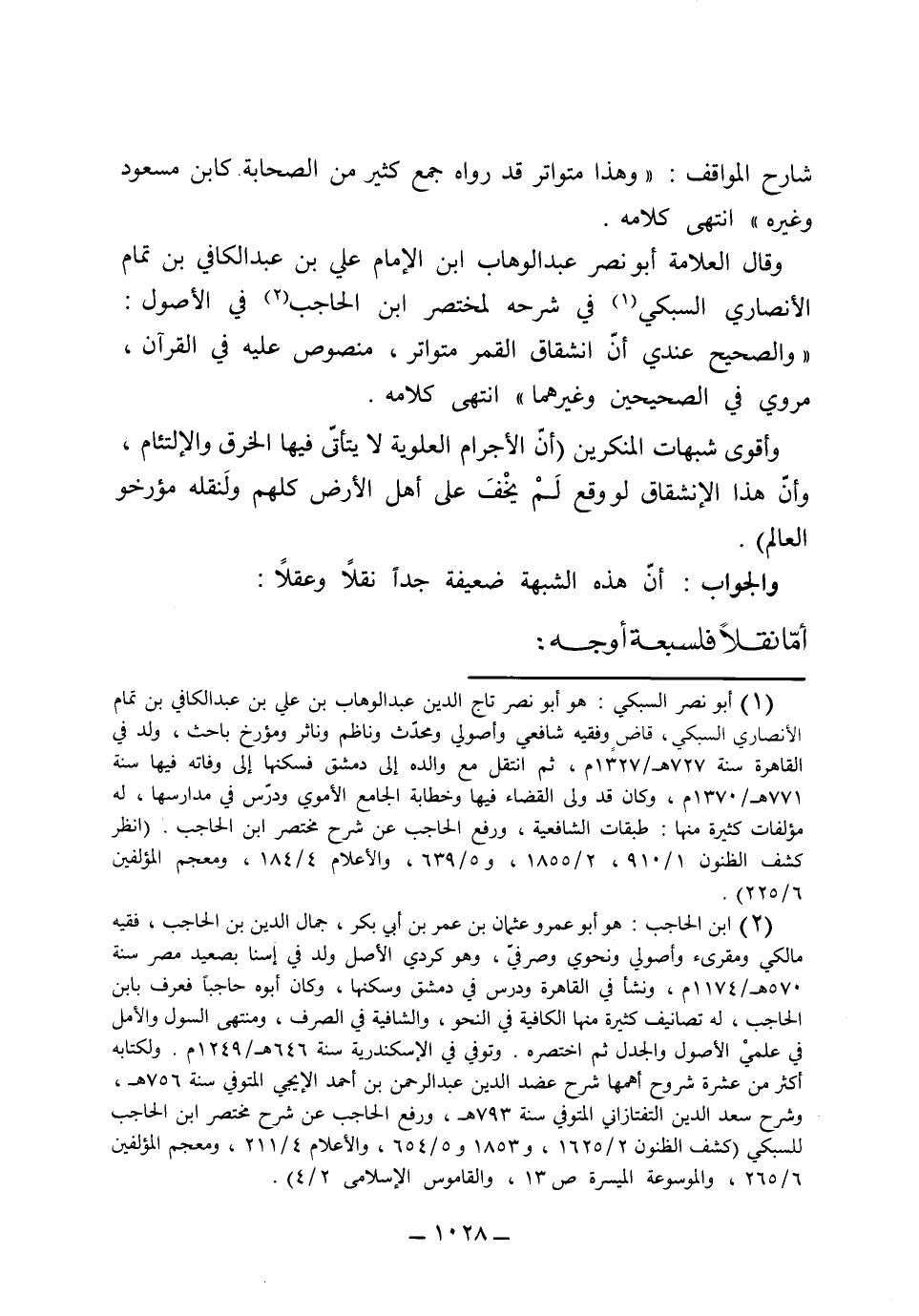 وقال العلامة أبو نصر عبد الوهاب ابن الإمام علي بن عبد الكافي بن تمام الأنصاري السبكي في شرحه لمختصر ابن الحاجب في الأصول: (والصحيح عندي أن انشقاق القمر متواتر منصوص عليه في القرآن مروي في الصحيحين وغيرهما) انتهى كلامه.