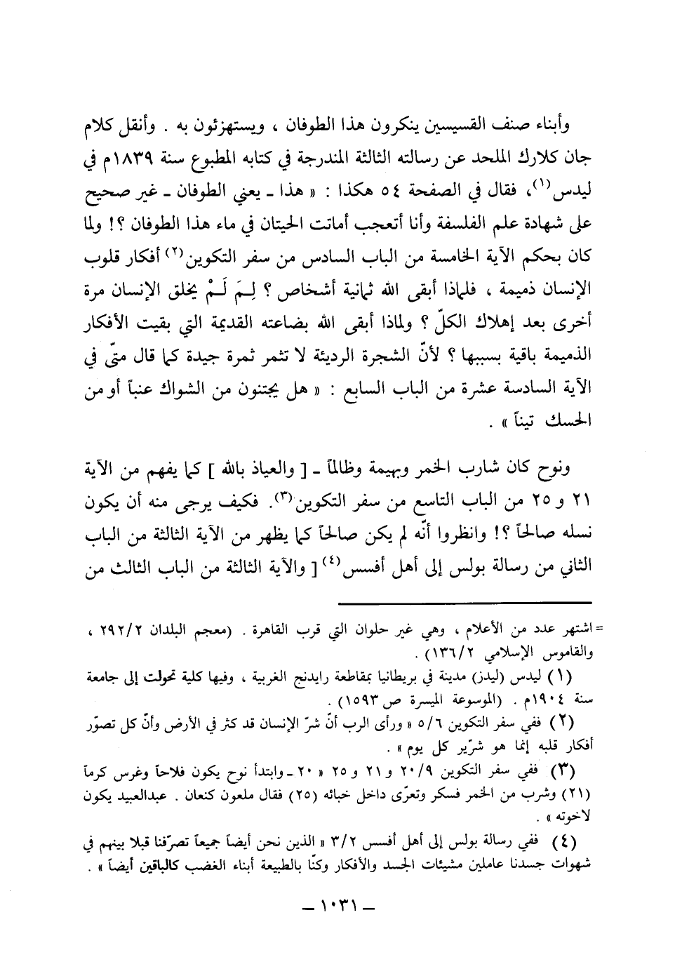 وأبناء صنف القسيسين ينكرون هذا الطوفان ويستهزئون به. وأنقل كلام جان كلارك الملحد عن رسالته الثالثة المندرجة في كتابه المطبوع سنة 1839 في ليدس فقال في الصفحة 54: (هذا) يعني الطوفان، غير صحيح على شهادة علم الفلسفة وأنا أتعجب! أمات الحيتان في ماء هذا الطوفان؟.