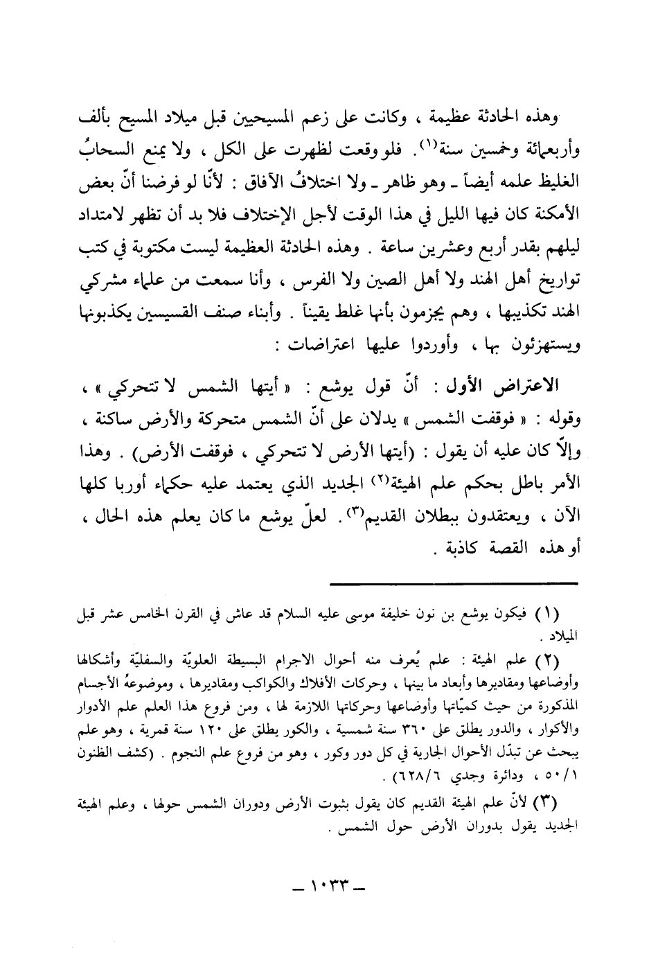 وهذه الحادثة عظيمة وكانت على زعم المسيحيين قبل ميلاد المسيح بألف وأربعمائة وخمسين سنة فلو وقعت لظهرت على الكل ولا يمنع السحاب الغليظ علمه أيضاً، وهو ظاهر ولا اختلاف في الآفاق لأنا لو فرضنا أن بعض الأمكنة كان فيها الليل في هذا الوقت لأجل الاختلاف فلا بد أن تظهر لامتداد ليلهم بقدر أربع وعشرين ساعة. وهذه الحادثة العظيمة ليست مكتوبة في كتب تواريخ أهل الهند ولا أهل الصين ولا الفرس. وأنا سمعت من علماء مشركي الهند تكذيبها، وهم يجزمون بأنها غلط يقيناً، وأبناء صنف القسيسين يكذبونها ويستهزئون بها وأوردوا عليها اعتراضات: