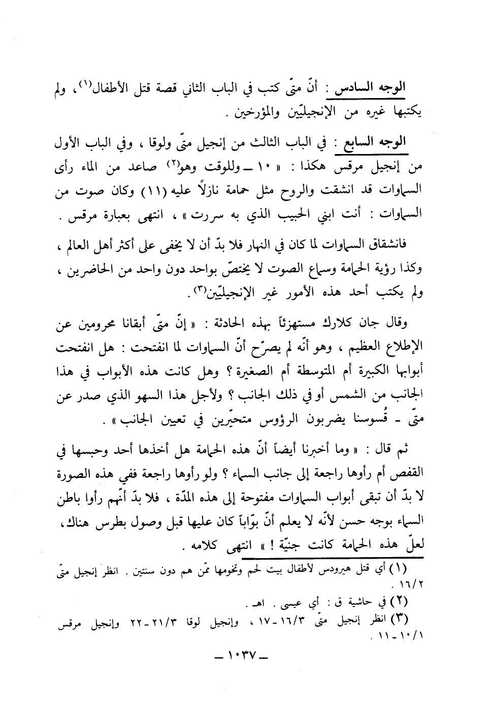 (الوجه السابع) في الباب الثالث من إنجيل متى ولوقا، وفي الباب الأول من إنجيل مرقس هكذا: (فساعة طلع من الماء رأى السماوات قد انشقت والروح مثل حمامة نازلاً عليه، وكان صوت من السماوات (أنت ابني الحبيب الذي به سررت) انتهى بعبارة مرقس.