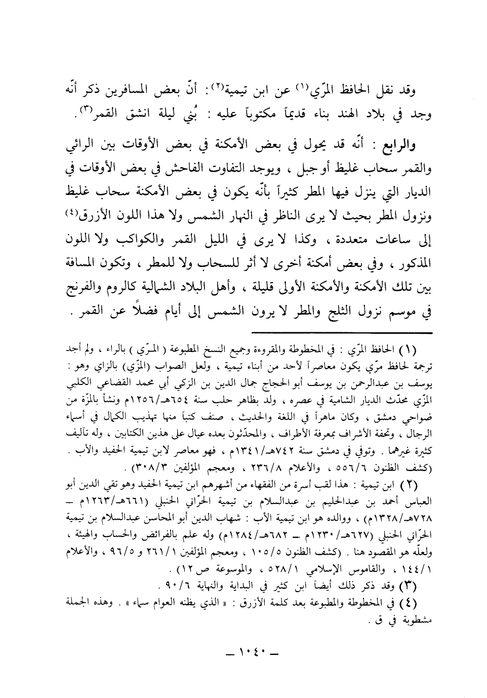 (والرابع) أنه قد يحول في بعض الأمكنة وفي بعض الأوقات بين الرائي والقمر، سحاب غليظ أو جبل، ويوجد التفاوت الفاحش في بعض الأوقات في الديار التي ينزل فيها المطر كثيراً، بأنه يكون في بعض الأمكنة سحاب غليظ ونزول المطر بحيث لا يرى الناظر في النهار الشمس ولا هذا اللون الأزرق إلى ساعات متعددة، وكذا لا يرى في الليل القمر والكواكب ولا اللون المذكور. وفي بعض أمكنة أخرى لا أثر للسحاب ولا للمطر وتكون المسافة بين تلك الأمكنة والأمكنة الأولى قليلة، وأهل البلاد الشمالية كالروم والفرنج في موسم نزول الثلج والمطر لا يرون الشمس إلى أيام، فضلاً عن القمر.