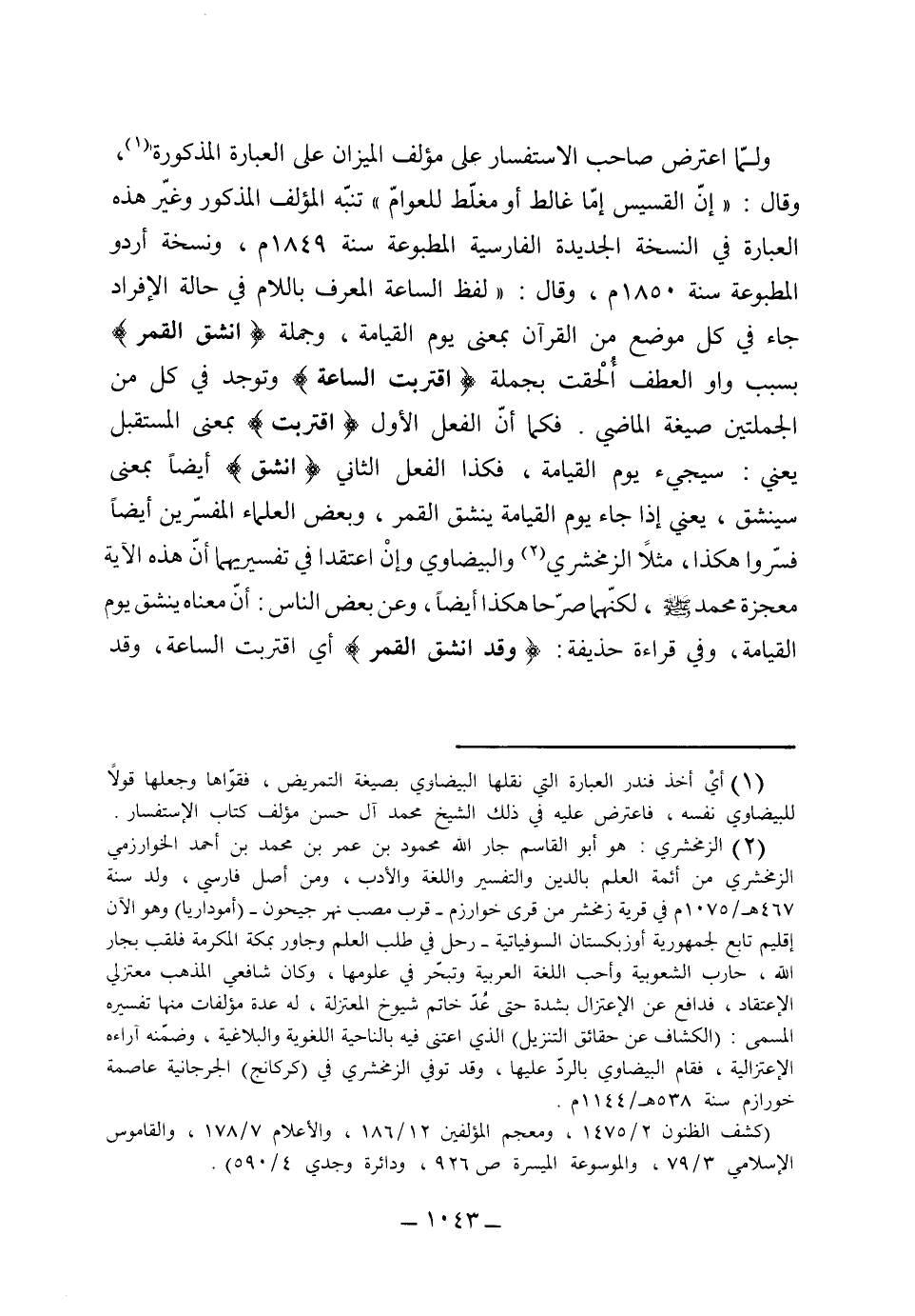 ولما اعترض صاحب الاستفسار على مؤلف الميزان على العبارة المذكورة وقال: (أن القسيس إما غالط أو مغلط للعوام) . تنبه المؤلف المذكور وغير هذه العبارة في النسخة الجديدة الفارسية المطبوعة سنة 1849، ونسخة أردو المطبوعة سنة 1850 وقال: (لفظ الساعة المعرف باللام في حالة الأفراد جاء في كل موضع من القرآن بمعنى يوم القيامة، وجملة انشق القمر بسبب واو العطف ألحقت بجملة اقتربت الساعة، وتوجد في كل من الجملتين صيغة الماضي، فكما أن الفعل الأول اقتربت بمعنى المستقبل يعني سيجيء يوم القيامة، فكذا الفعل الثاني انشق أيضاً بمعنى سينشق يعني إذا جاء يوم القيامة ينشق القمر، وبعض العلماء المفسرين أيضاً فسروا هكذا مثل الزمخشري والبيضاوي، وإن اعتقدا في تفسيرهما أن هذه الآية معجزة محمد صلى الله عليه وسلم، لكنهما صرحا هكذا أيضاً. وعن بعض الناس أن معناه ينشق يوم القيامة، وفي قراءة حذيفة وقد انشق القمر أي اقتربت الساعة، وقد