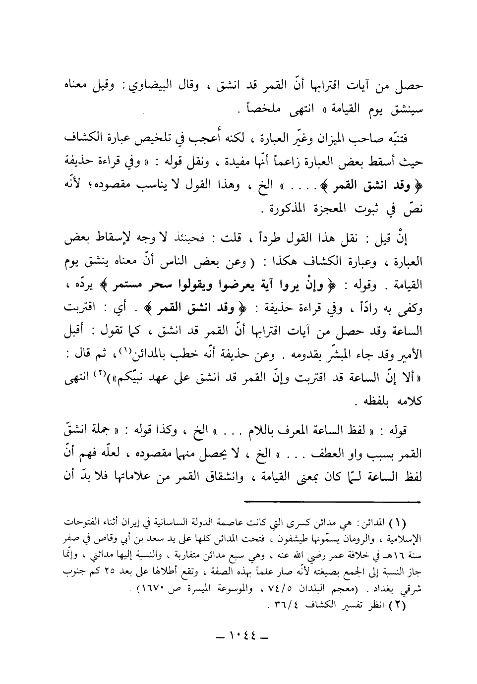 فتنبه صاحب الميزان وغير العبارة، لكنه أعجب في تلخيص عبارة الكشاف حيث أسقط بعض العبارة زاعماً أنها غير مفيدة ونقل قوله: وفي قراءة حذيفة وقد انشق القمر الخ. وهذا القول لا يناسب مقصوده لأنه نص في ثبوت المعجزة المذكورة أن قيل: نقل هذا القول طرداً قلت فحينئذ لا وجه لإسقاط بعض العبارة، وعبارة الكشاف هكذا: (وعن بعض الناس أن معناه ينشق يوم القيامة. وقوله: وإن يروا آية يعرضوا ويقولوا سحر مستمر يرده وكفى به رداً قراءة حذيفة قد انشق القمر أي اقتربت الساعة، وقد حصل من آيات اقترابها إن القمر قد انشق كما تقول أقبل الأمير وقد جاء البشير بقدومه وعن حذيفة أنه خطب بالمدائن ثم قال: ألا إن الساعة قد اقتربت وأن القمر قد انشق على عهد نبيكم) انتهى كلامه بلفظه.