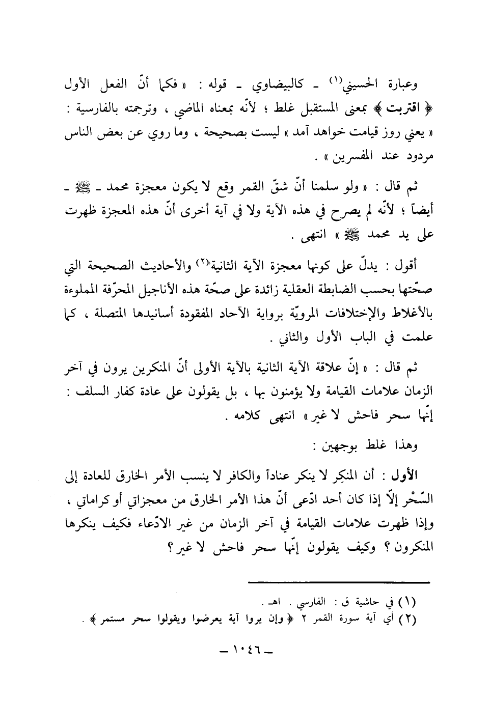 وعبارة الحسيني كالبيضاوي قوله: فكما أن الفعل الأول اقتربت بمعنى المستقبل غلط لأنه بمعناه الماضي وترجمته بالفارسية يعني (رزو قيامت خواهد آمد) ليست بصحيحة، وما روي عن بعض الناس مردود عند المفسرين.