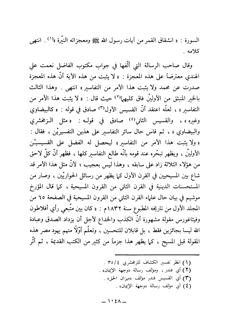 وقال صاحب الرسالة التي ألفها في جواب مكتوب الفاضل نعمت على الهند معترضاً على هذه المعجزة: (لا يثبت من هذه الآية أن هذه المعجزة صدرت عن محمد صلى الله عليه وسلم، ولا يثبت هذا الأمر من التفاسير) انتهى.