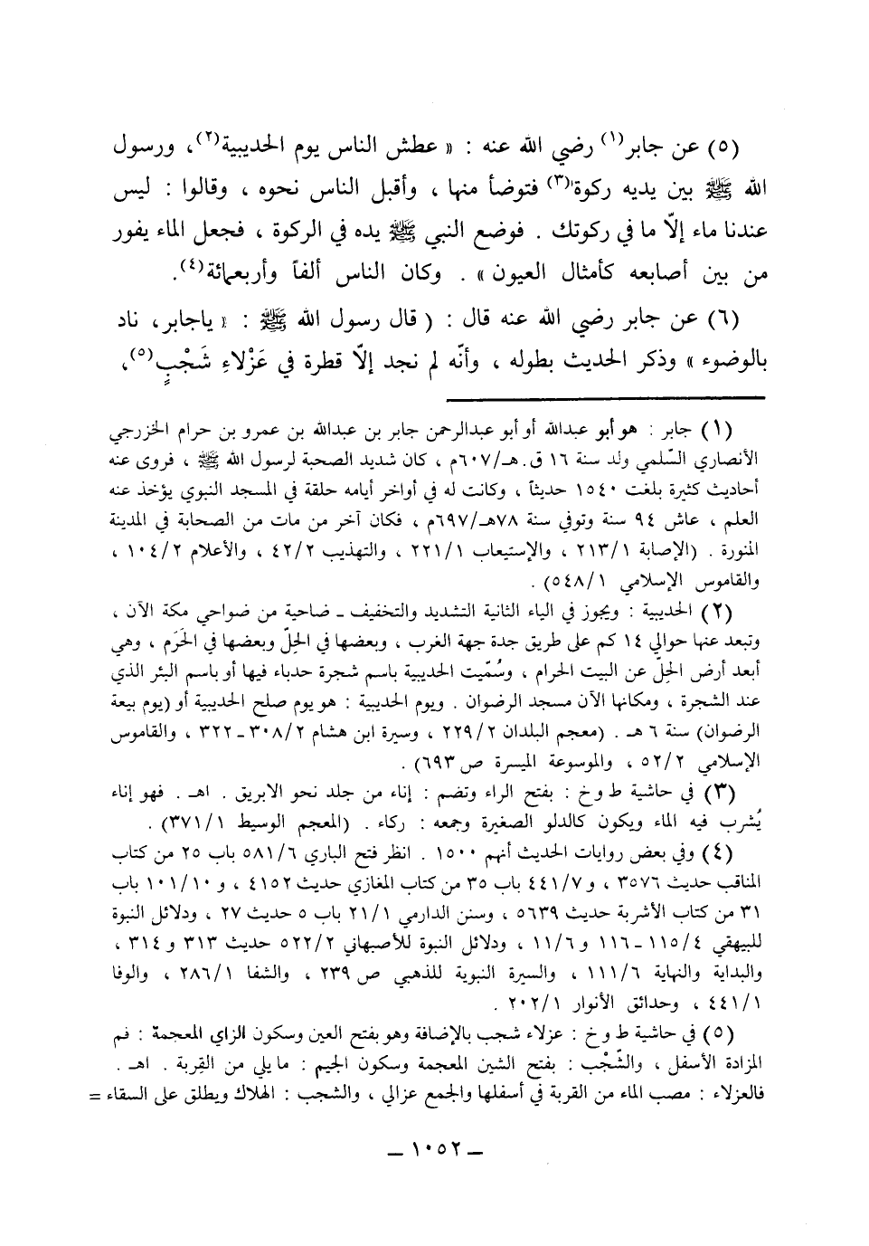 6- عن جابر رضي الله عنه (قال: قال لي رسول الله صلى الله عليه وسلم: يا جابر ناد بالوضوء وذكر الحديث بطوله وأنه لم نجد إلا قطرة في عزلاء شجب