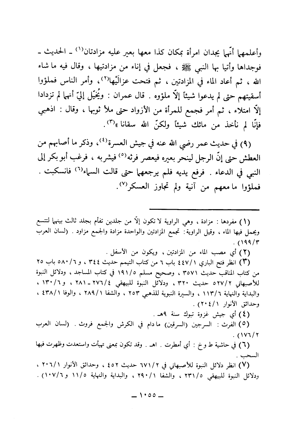 9- في حديث عمر رضي الله عنه في جيش العسرة وذكر ما أصابهم من العطش، حتى أن الرجل ينحر بعيره فيعصر فرثه فيشربه، فرغب أبو بكر إلى النبي في الدعاء، فرفع يديه فلم يرجعهما حتى قالت 2 السماء فانسكبت فملؤوا ما معهم من آنية ولم تجاوز العسكر.