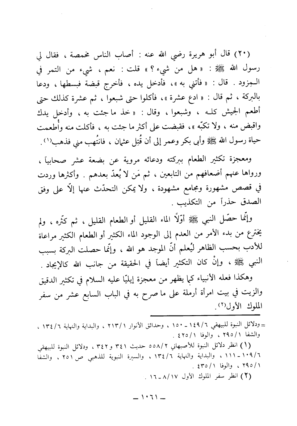 ومعجزة تكثير الطعام ببركة دعائه مروية عن بضعة عشر صحابياً، ورواه عنهم أضعافهم من التابعين، ثم من لا يعد بعدهم، وأكثرها وردت في قصص مشهورة ومجامع مشهورة، ولا يمكن التحدث عنها إلا على وفق الصدق حذراً من التكذيب، وإنما حصل النبي صلى الله عليه وسلم أولاً الماء القليل أو الطعام القليل ثم كثره، ولم يخترع من بدء الأمر من العدم إلى الوجود الماء الكثير، أو الطعام الكثير، مراعاة للأدب بحسب الظاهر ليعلم أن الموجد هو الله. وإنما حصلت البركة بسبب النبي صلى الله عليه وسلم. وإن كان التكثير أيضاً في الحقيقة من جانب الله كالإيجاد. وهكذا فعله الأنبياء كما يظهر من معجزة ايلياء عليه السلام في تكثير الدقيق والزيت في بيت امرأة أرملة على ما صرح به في الباب السابع عشر من سفر الملوك الأول،
